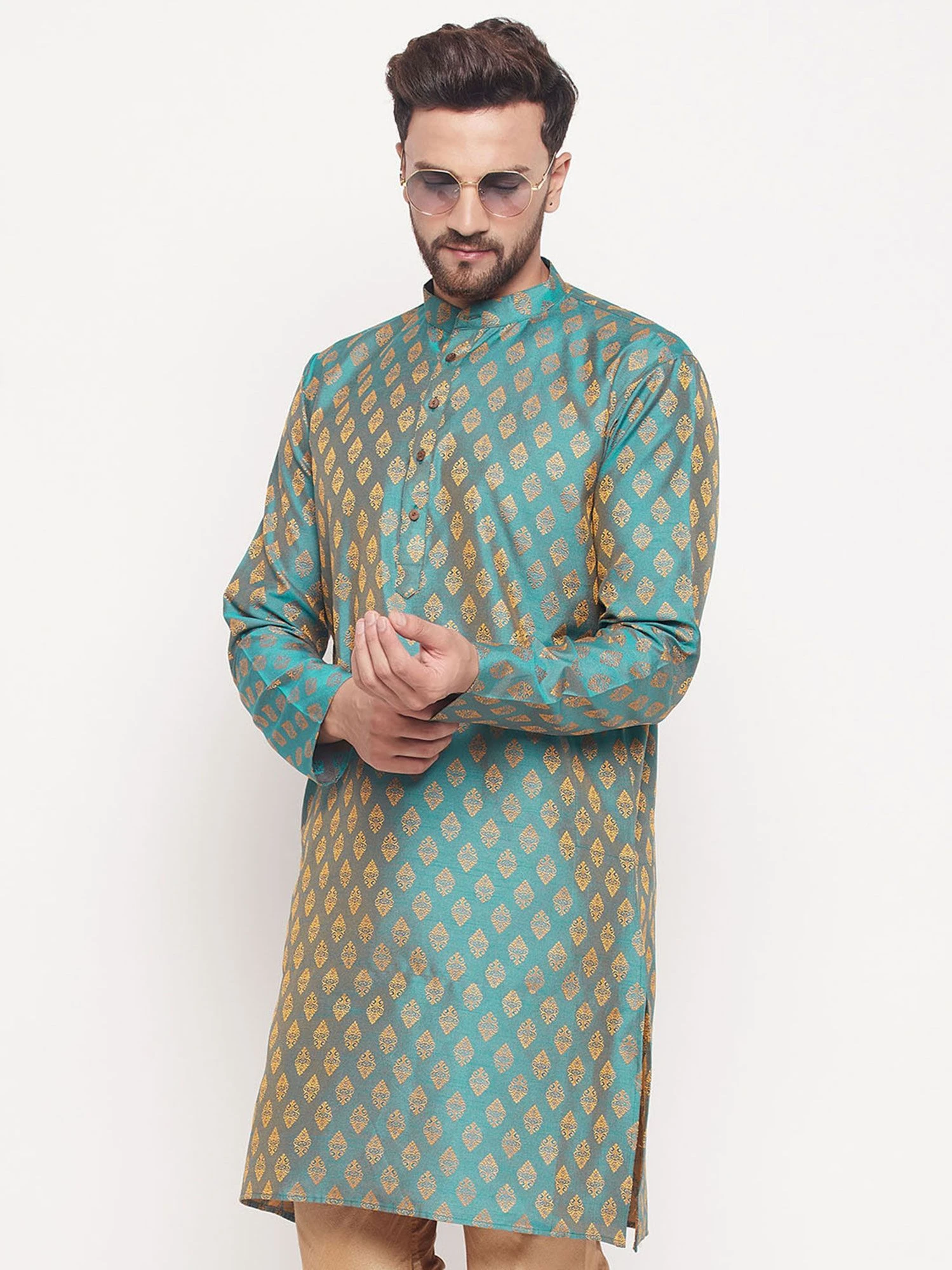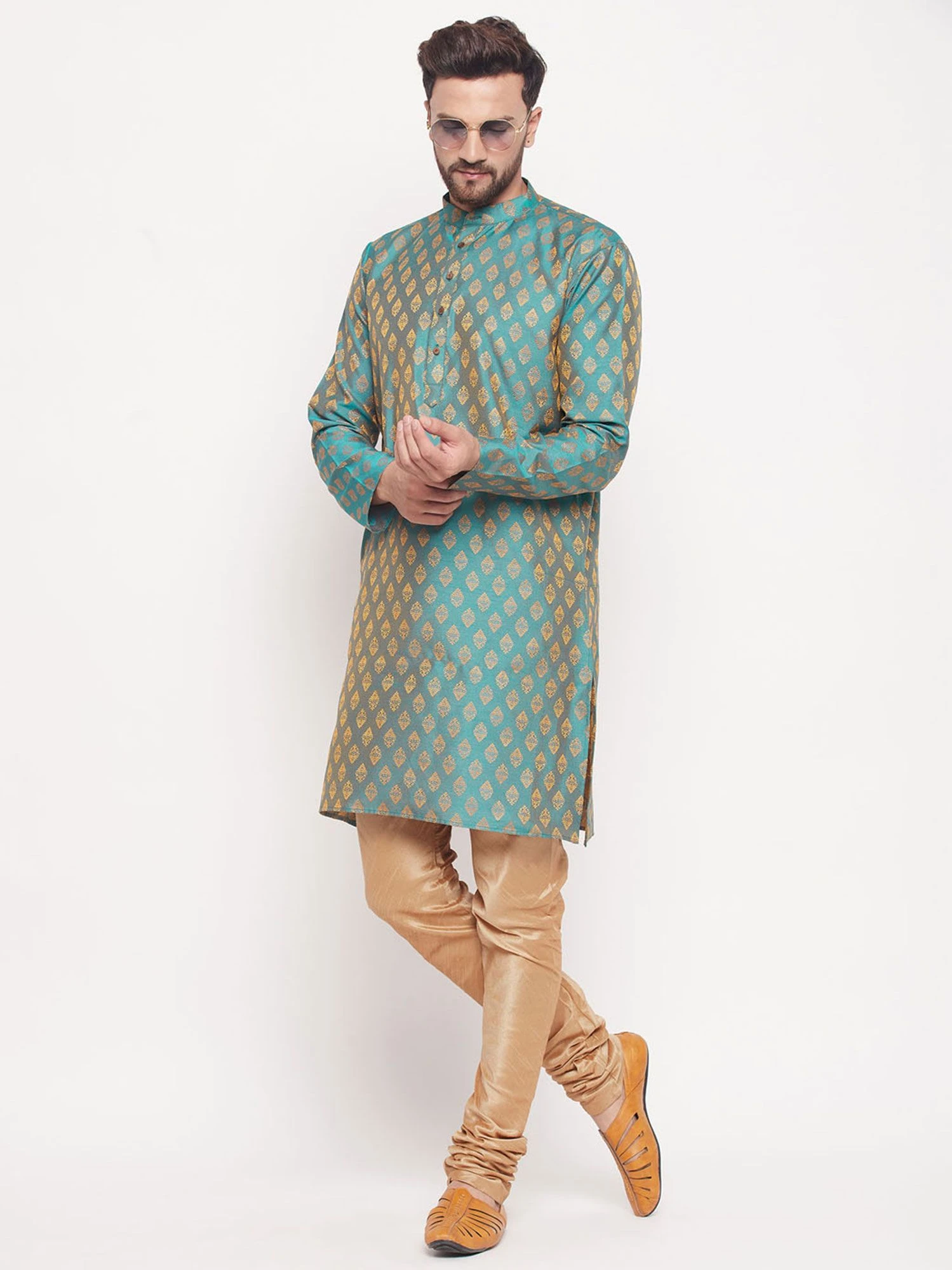 Set yourself a class apart adorning this blue color kurta made in art silk. Decorated with woven details all over, designed using buttoned placket and mandarin collar. Available with a beige color churidaar pants in art silk. Note: Some color variations may occur owing to photography causes. Up to 1 inch of measurement fluctuation is possible.