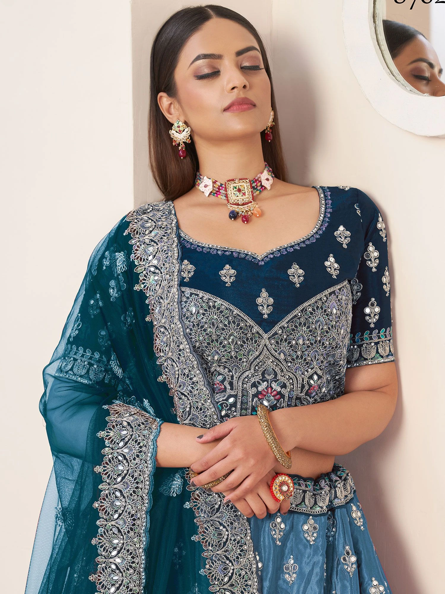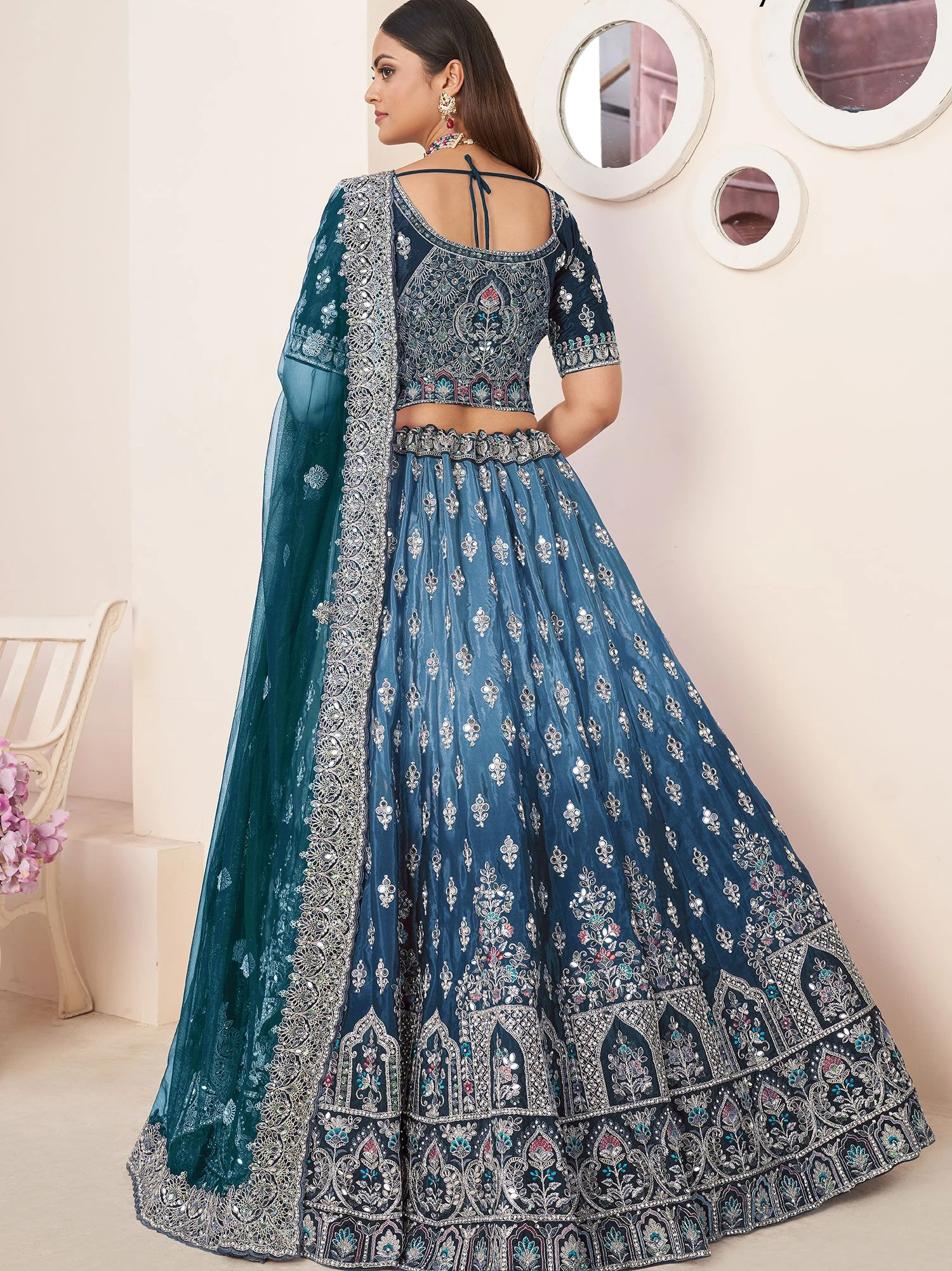 Magnificence after you dresses this aegean blue color lehenga in satin. Augmented with sequins, stones, mirror work and zari embroidery work. Paired with a matching color embroidered choli made in satin and a dupatta made in net. Note: The accessories featured are purely for fashion purposes. Due to photography reasons, some color variations may occur. The semi-stitched choli and lehenga waist may be customized up to 42 inches.