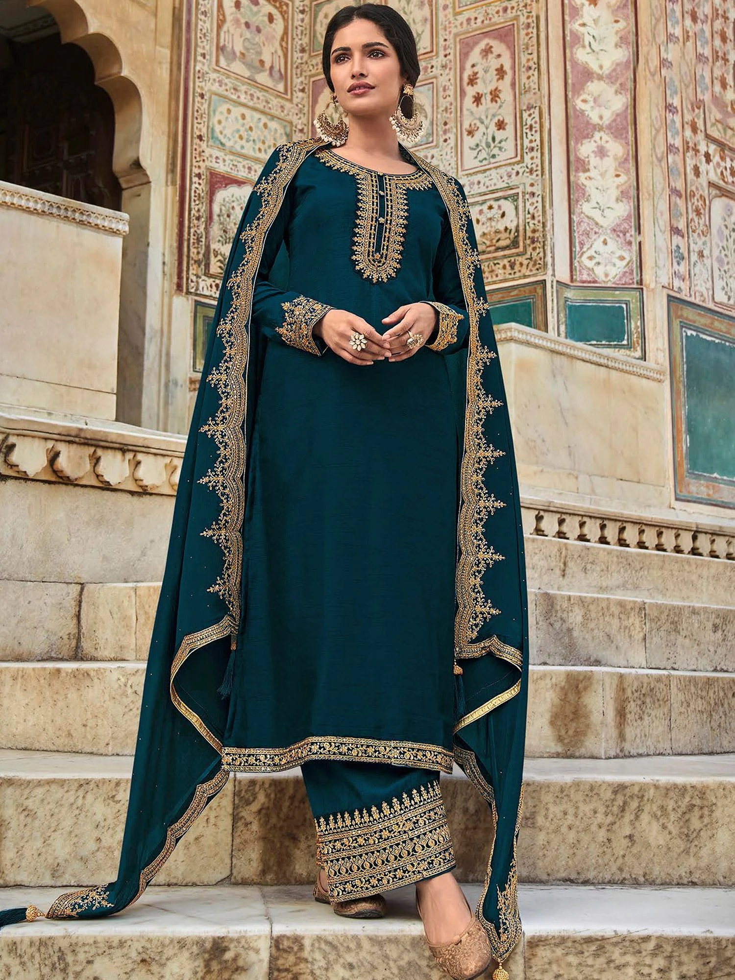 Drape yourself in elegance adorning this prussian blue color straight cut kameez in art silk. Enhanced using sequins and zari work embroidery all over. Teamed with a blue embroidered dupatta in chiffon and matching pants in art silk. Note: Accessories shown are for styling purpose only. Slight color variation may occur due to photographic reasons. The semi-stitched kameez can be customised upto 42 inches.