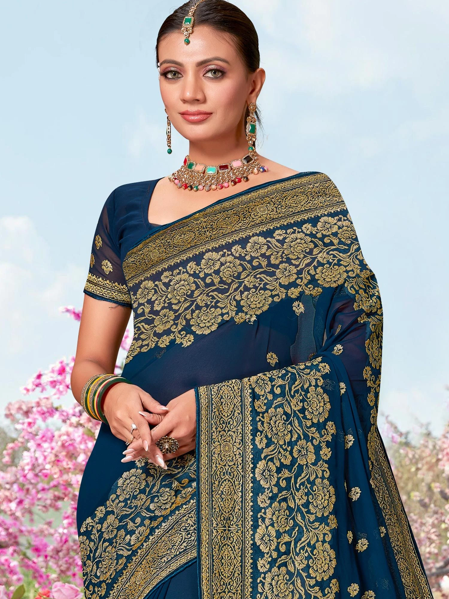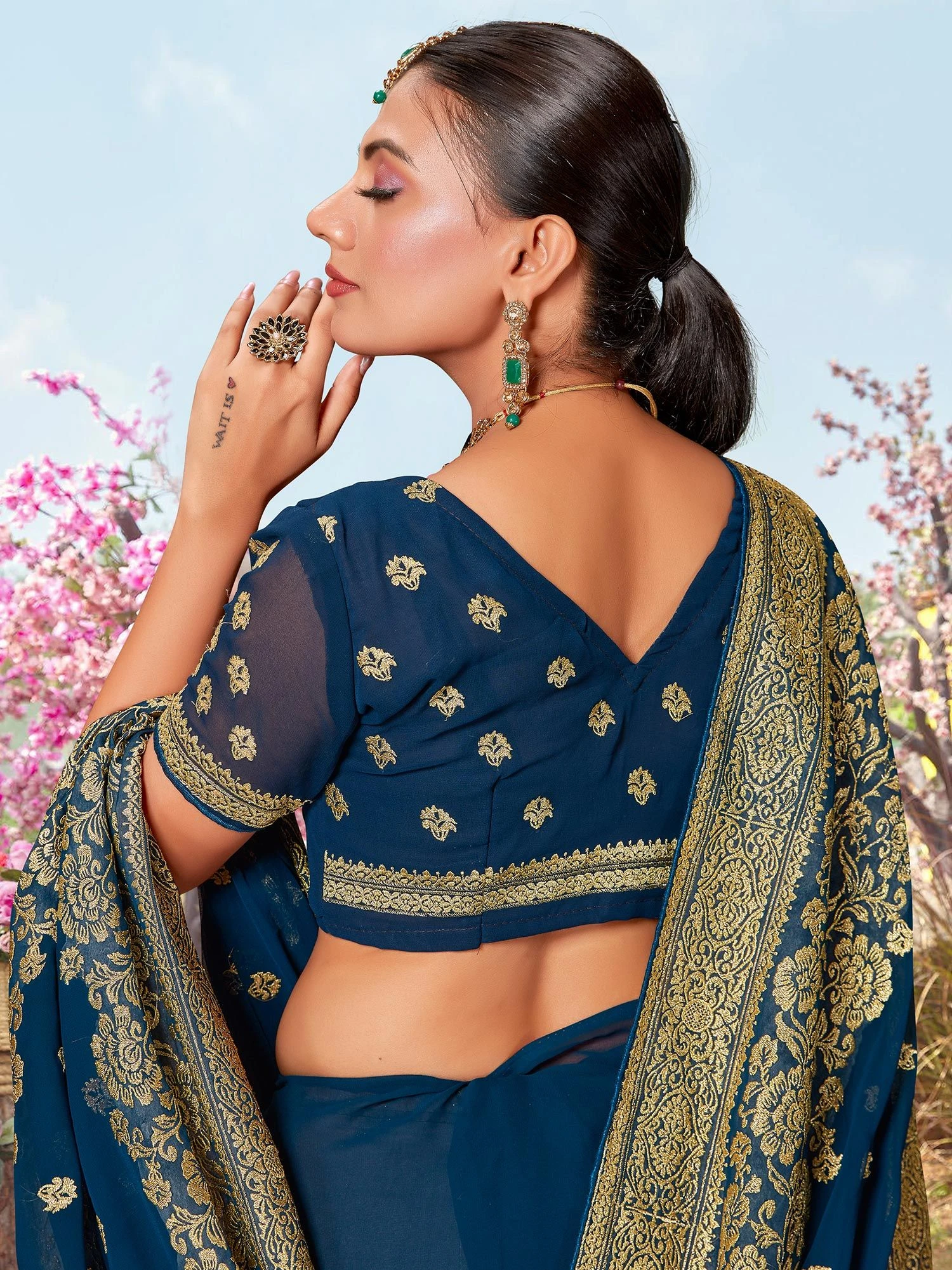 Make an everlasting impression adorning this denim blue color saree made in georgette. Augmented using zari woven patterns, displaying unique borders and pallu. Paired with a matching blue color zari woven blouse in georgette. Note: The accessories featured are purely for fashion purposes. Due to photography reasons, some color variations may occur. The un-stitched blouse may be customized up to 42 inches.