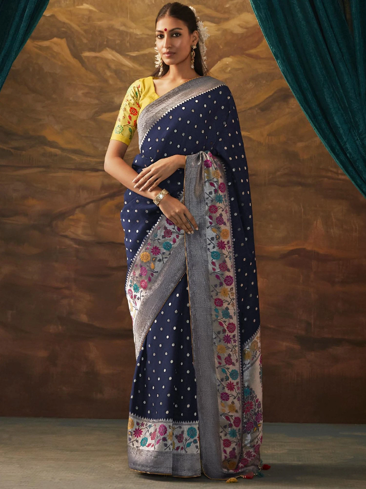Casting a magical aura with every move wearing this denim blue color saree crafted in dola silk. Enhanced using thread, zari woven and printed patterns, showcasing distinstive borders and pallu. Comes with a matching yellow color blouse in dola silk. Note: The accessories featured are purely for fashion purposes. Due to photography reasons, some color variations may occur. The un-stitched blouse may be customized up to 42 inches.
