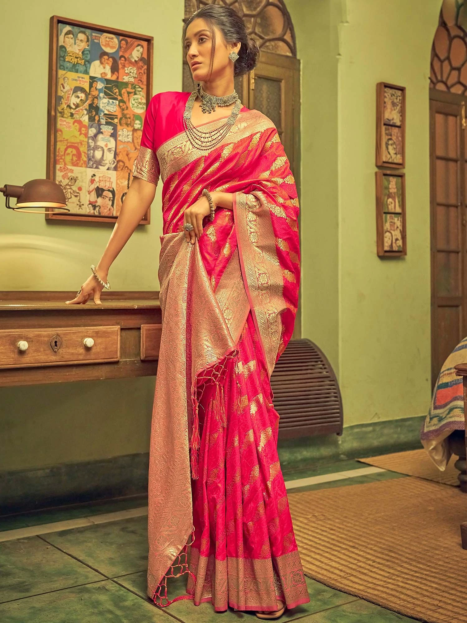 Get all dolled up wearing this punch pink color saree crafted in banarasi silk. Designed using zari woven patterns all over, showcasing distinstive borders and pallu. Available with a matching pink color blouse in banarasi silk. Note: The accessories featured are purely for fashion purposes. Due to photography reasons, some color variations may occur. The un-stitched blouse may be customized up to 42 inches.