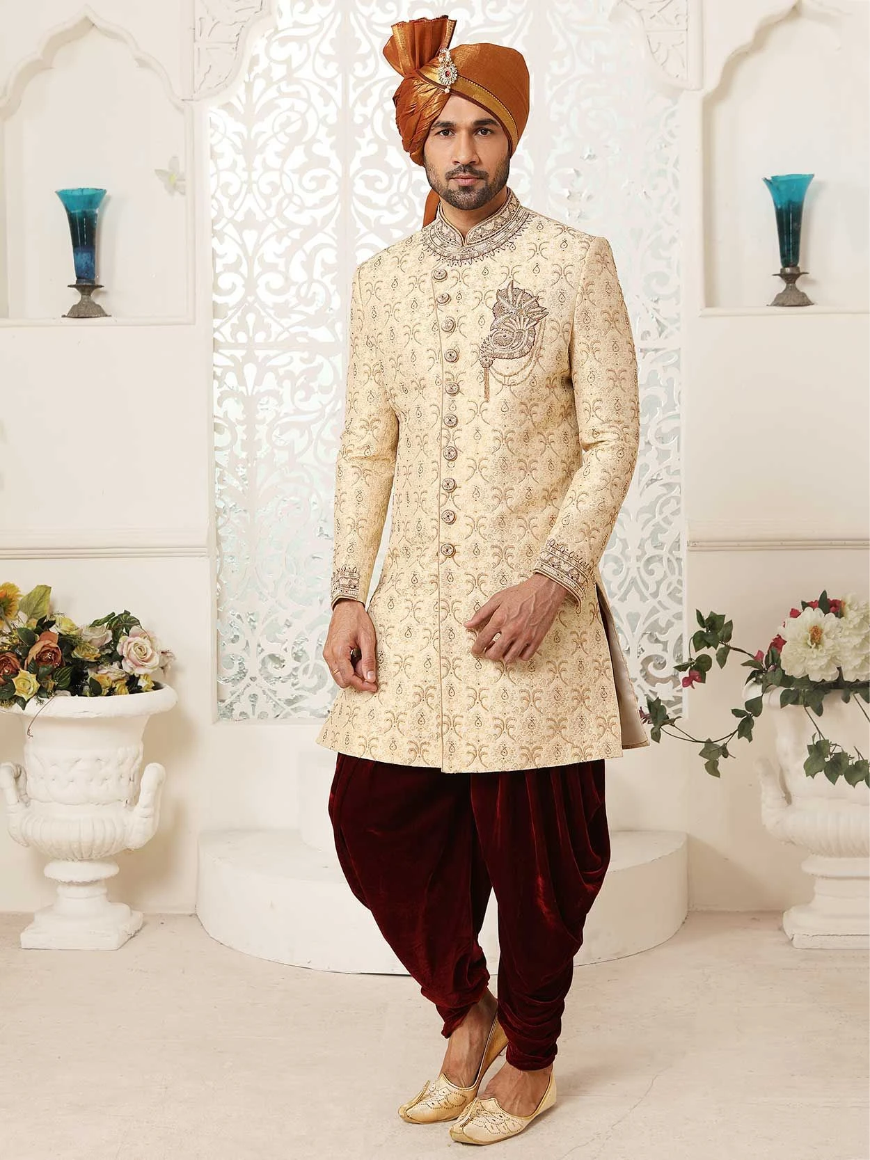 Look enchanting in this Cream Colour Brocade Fabric Mens Designer Sherwani With Matching Patiala Style Pajama in Thread,Zari,Hand Work.