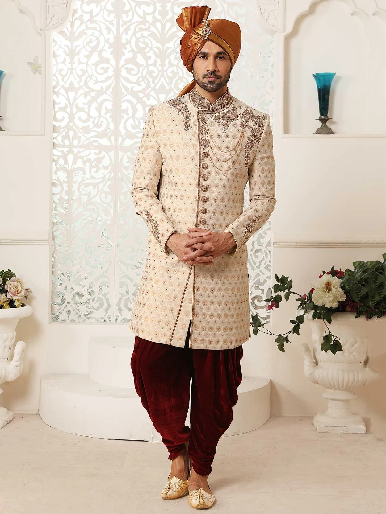 Make an long lasting impression clad with this Cream Colour Brocade Fabric Mens Sherwani With Matching Patiala Style Pajama in Thread,Zari,Hand Work.
