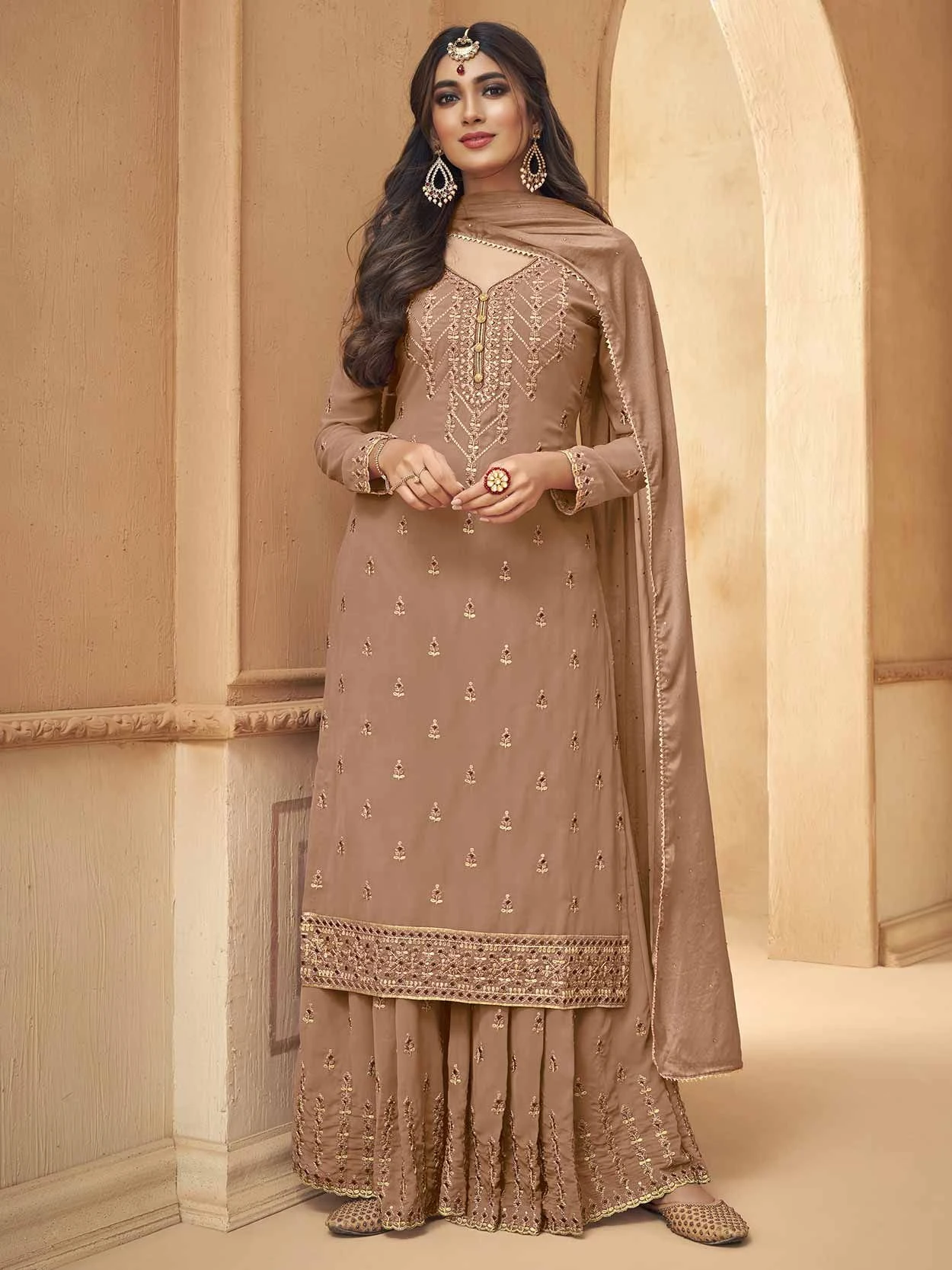 Brown Colour Faux Georgette Fabric Wonderful Unstitched Salwar Kameez The lovely Zari,Embroidery,Sequins work a substantial attribute of this attire.