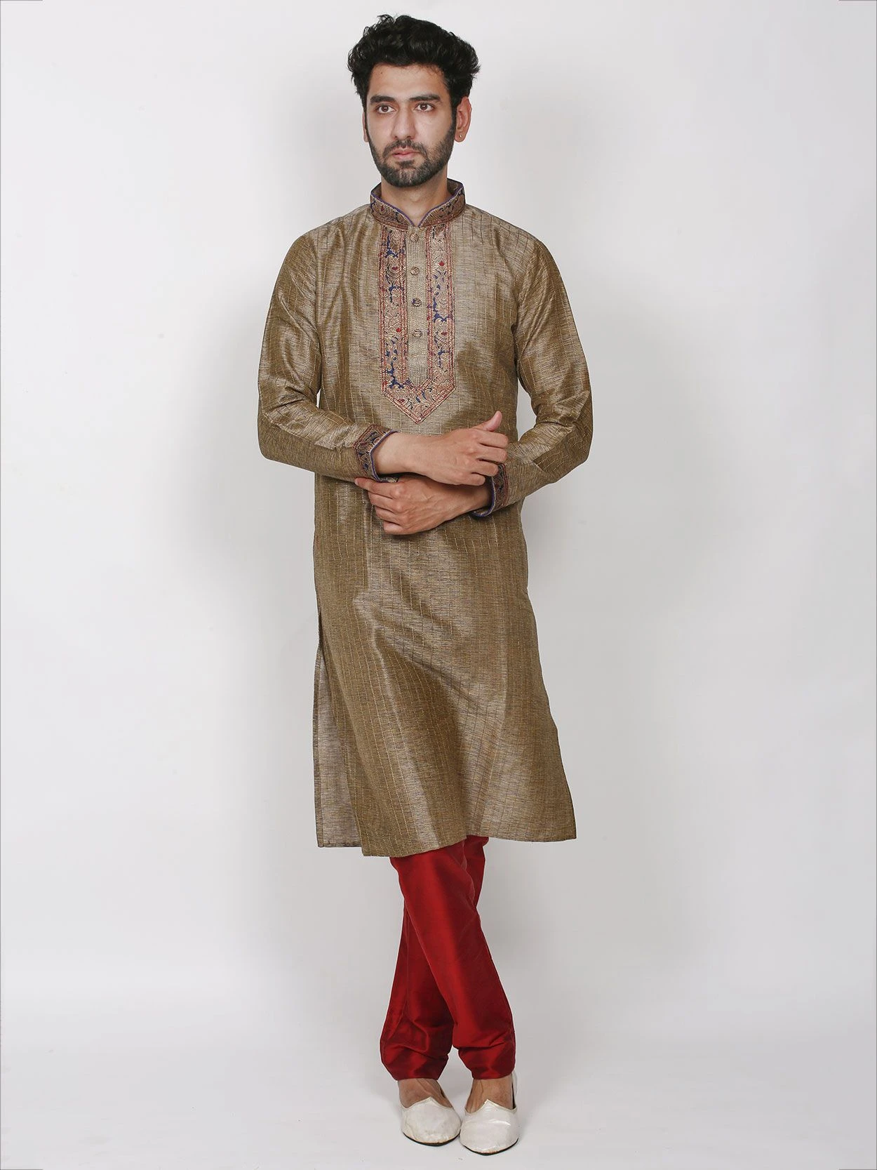 Attain a stylish look clad in this Brown Colour Silk Fabric Readymade Kurta Pajama. Garment features elaborate Readymade Kurta decorated with Zari,Thread Work.