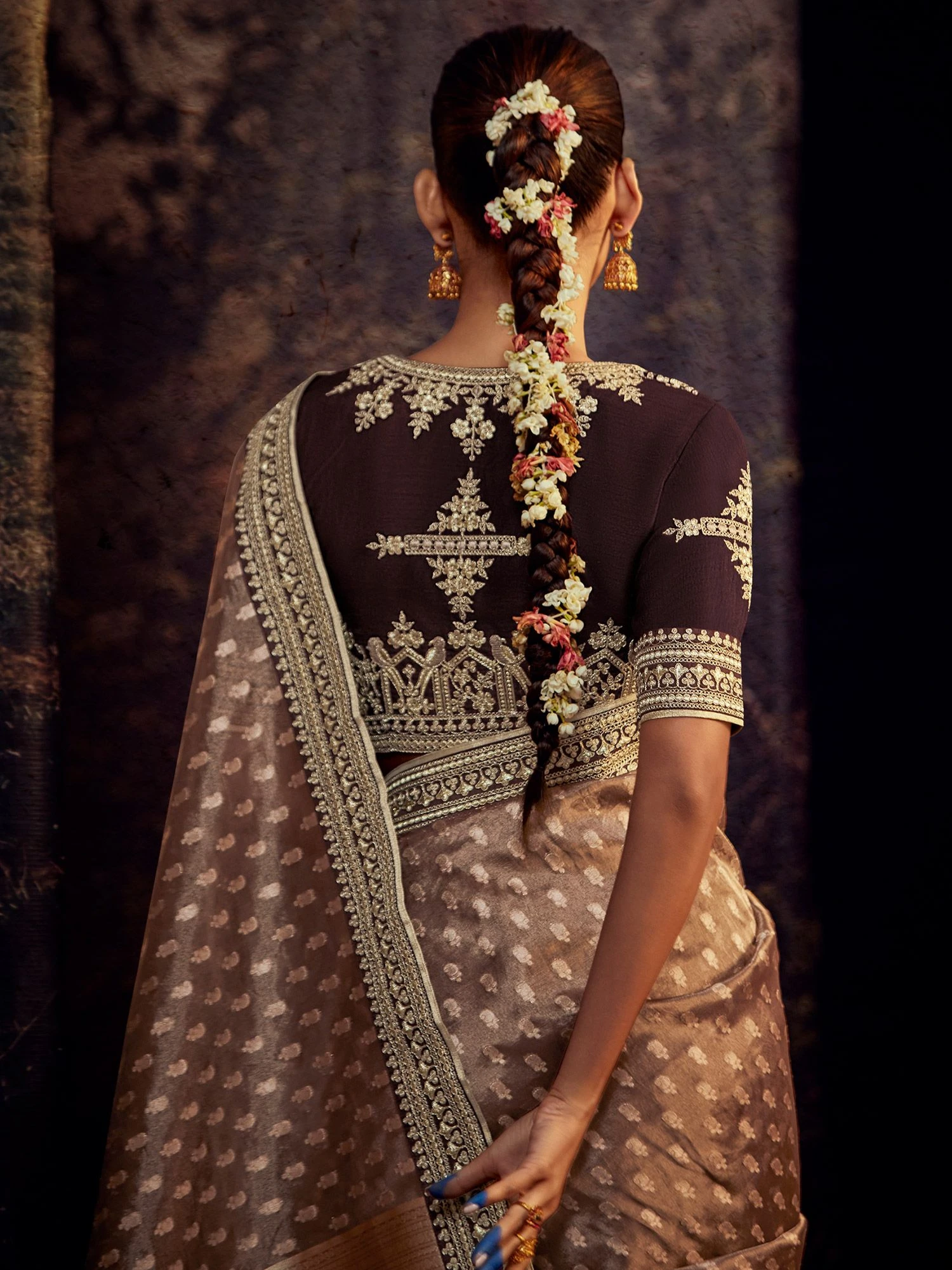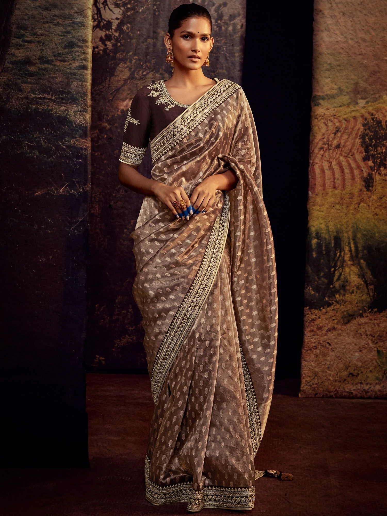 Reflect your glamours personality wearing this metallic brown color saree made in organza. Decorated using zari embroidered borders, showcasing distinstive borders and pallu. Comes with a matching dark brown color embroidered blouse. Note: The accessories featured are purely for fashion purposes. Due to photography reasons, some color variations may occur. The un-stitched blouse may be customized up to 42 inches.