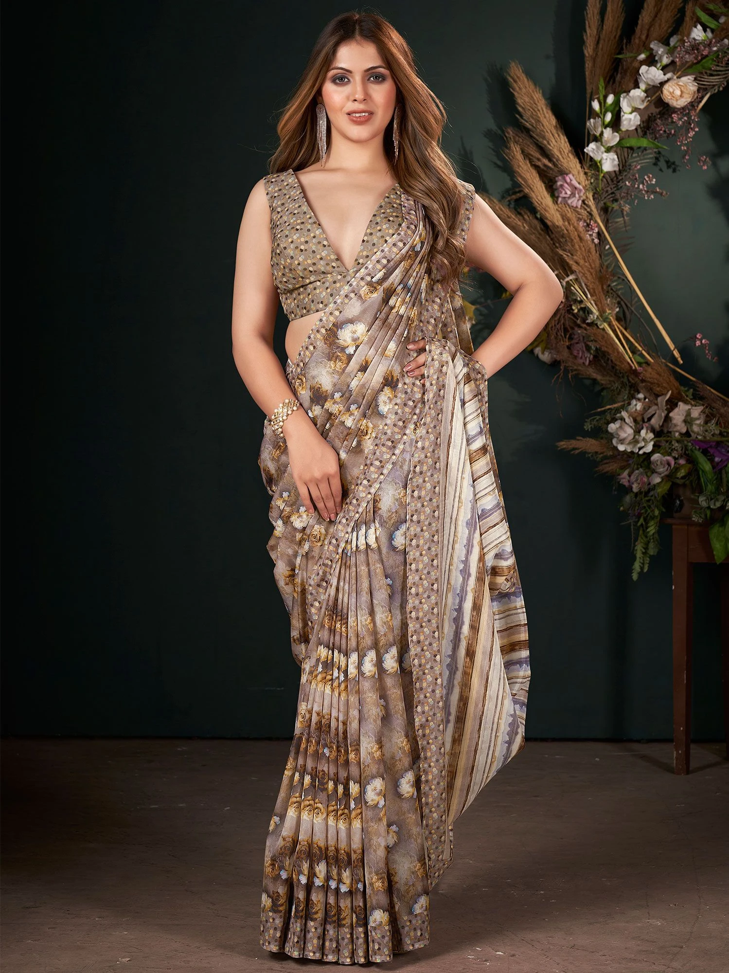 Get a graceful ethnic look with this tortilla brown color saree made in art silk. Drenched using digital floral printed patterns all over. Comes with a matching brown color printed blouse in art silk. Note: The accessories featured are purely for fashion purposes. Due to photography reasons, some color variations may occur. The un-stitched blouse may be customized up to 42 inches.