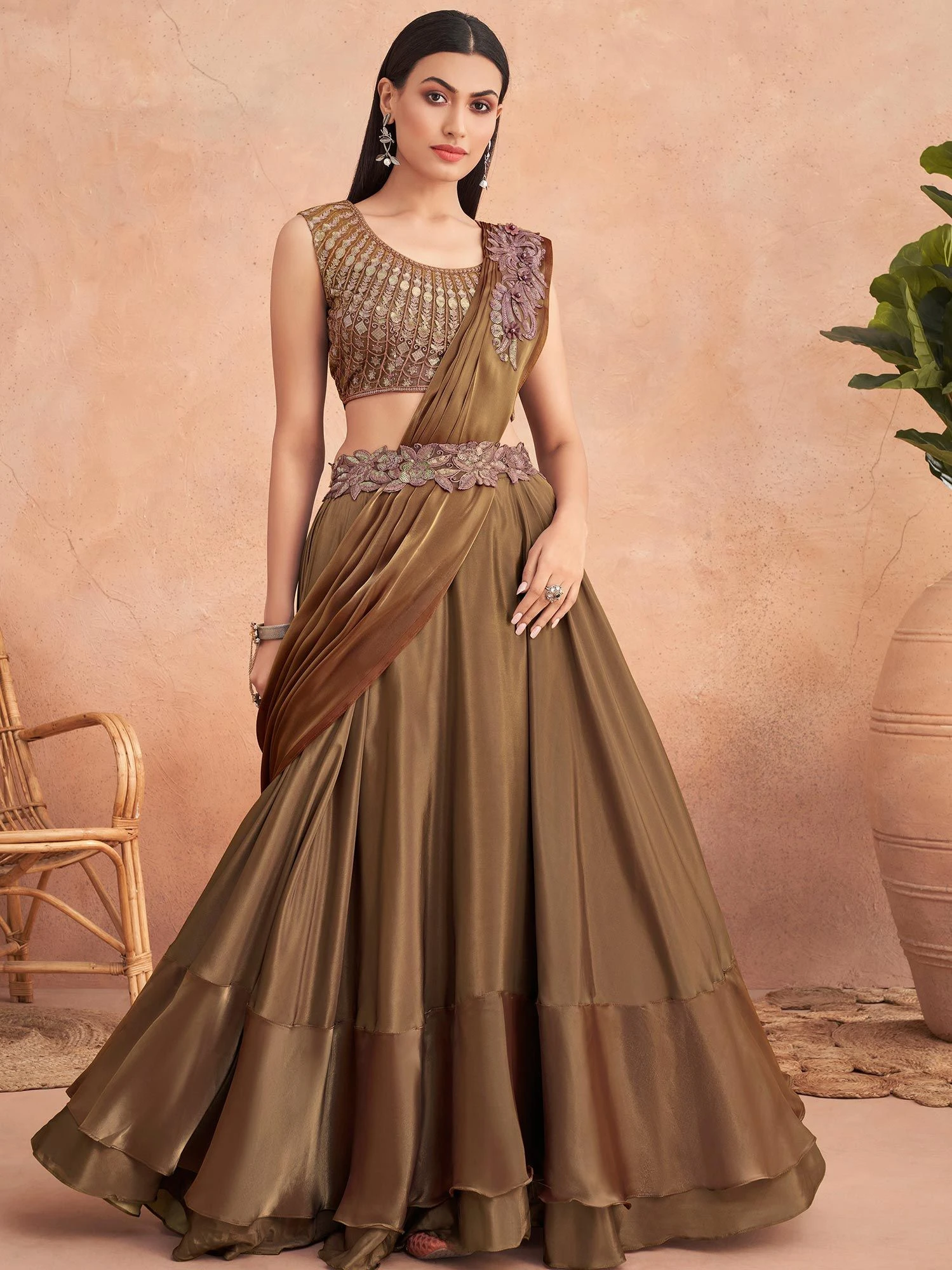 Steal the limelight as you wear this coffee brown color pre-draped saree in satin. Enhanced using sequins and thread embroidered work, showcasing distinstive edges. Paired with a matching embroidered brown color blouse in satin. Note: The accessories featured are purely for fashion purposes. Due to photography reasons, some color variations may occur. The un-stitched blouse may be customized up to 42 inches.