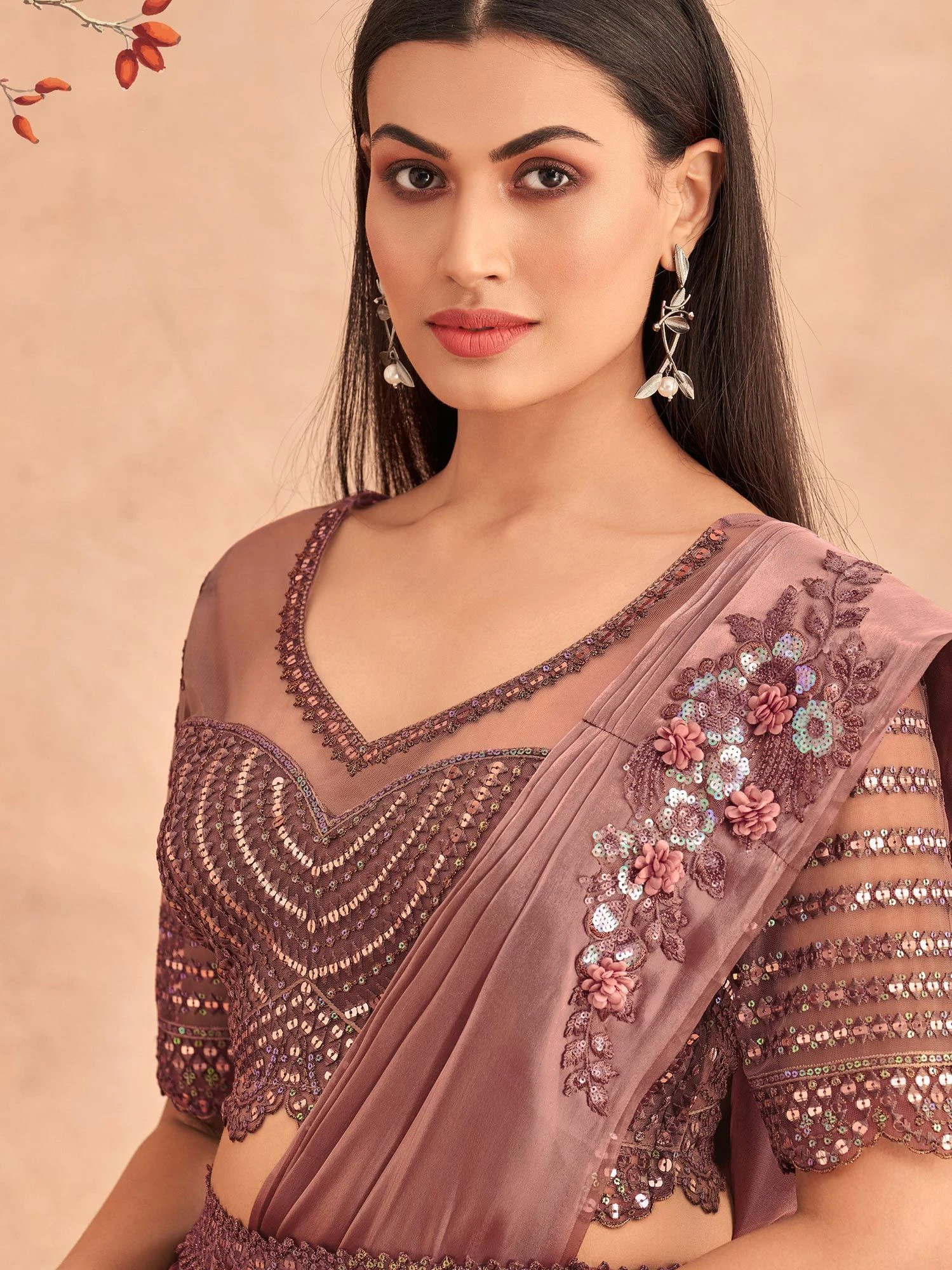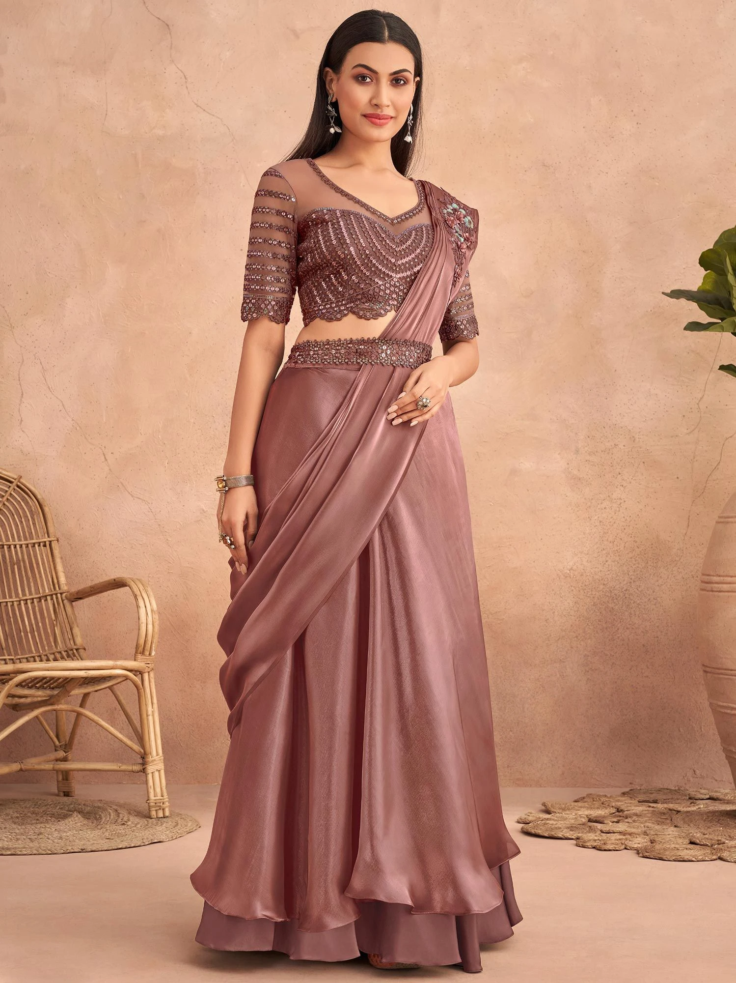 Be ready to turn some heads wearing this chestnut brown color pre-stitched saree in satin. Crafted using sequins and thread embroidered patterns, showcasing distinstive edges and waist. Teamed with a matching brown color embellished blouse in satin with net sleeves. Please Note: The accessories featured are purely for fashion purposes. Due to photography reasons, some color variations may occur. The un-stitched blouse may be customized up to 42 inches.