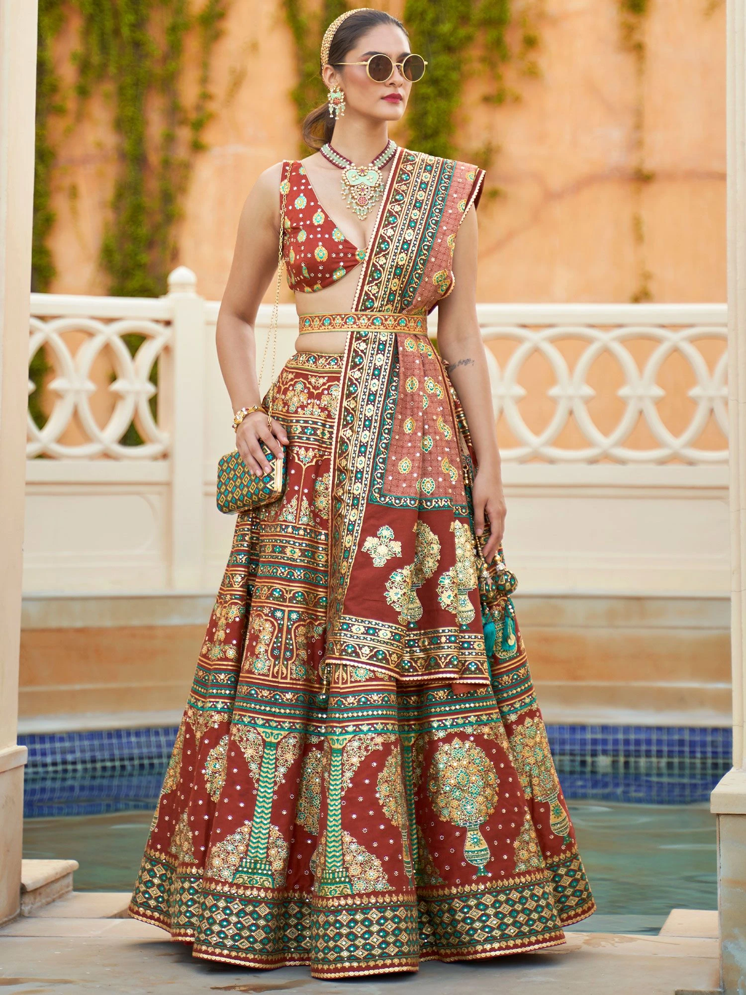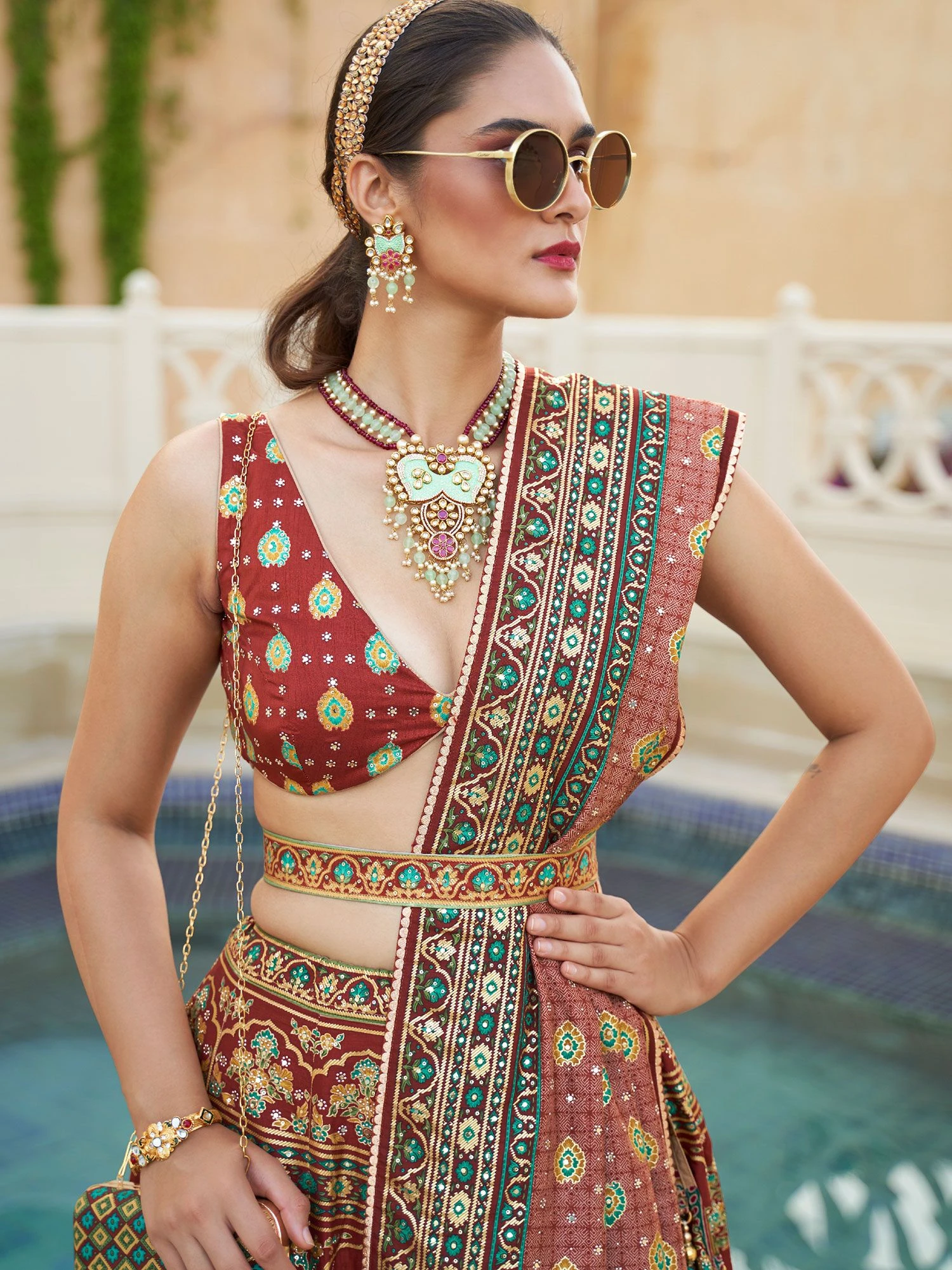 Step into the spotlight wearing this wood brown color readymade lehenga in silk. Crafted with traditional prints all over and stones, sequins, mirror like embroidered work. Teamed with a matching brown color embroidered silk choli, waist belt and a brown dupatta made in silk. Note: The accessories featured are purely for fashion purposes. Due to photography reasons, some color variations may occur. The semi-stitched choli and lehenga waist may be customized up to 42 inches.