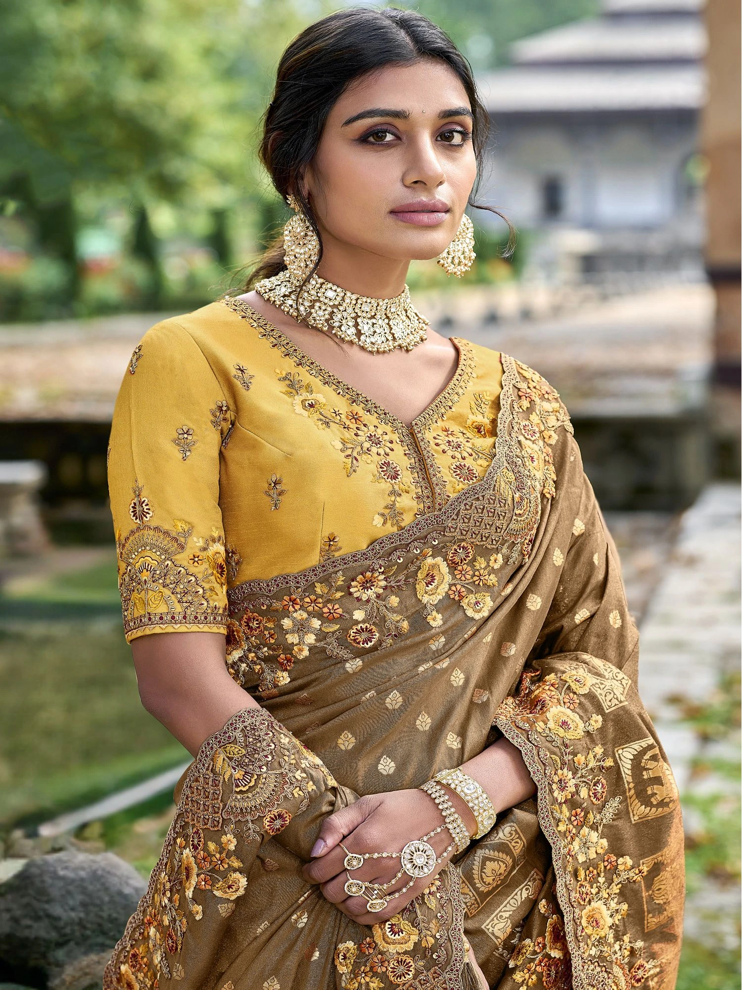 Add a story of tradition and beauty wearing this tortilla brown color saree crafted in silk. Enhanced using stones, zari and thread work embroidery, showcasing distinstive borders and pallu. Comes with a matching yellow color embroidered blouse in silk. Note: The accessories featured are purely for fashion purposes. Due to photography reasons, some color variations may occur. The un-stitched blouse may be customized up to 42 inches.