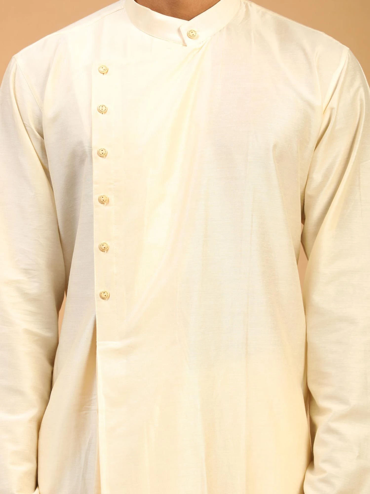 Get set to look all classy adorning this cream color asymmetric kurta made in art silk. Designed with mandarin collar and buttoned placket. embroidered details. Assembled with a cream color pants in art silk. Note: Some color variations may occur owing to photography causes. Up to 1 inch of measurement fluctuation is possible.