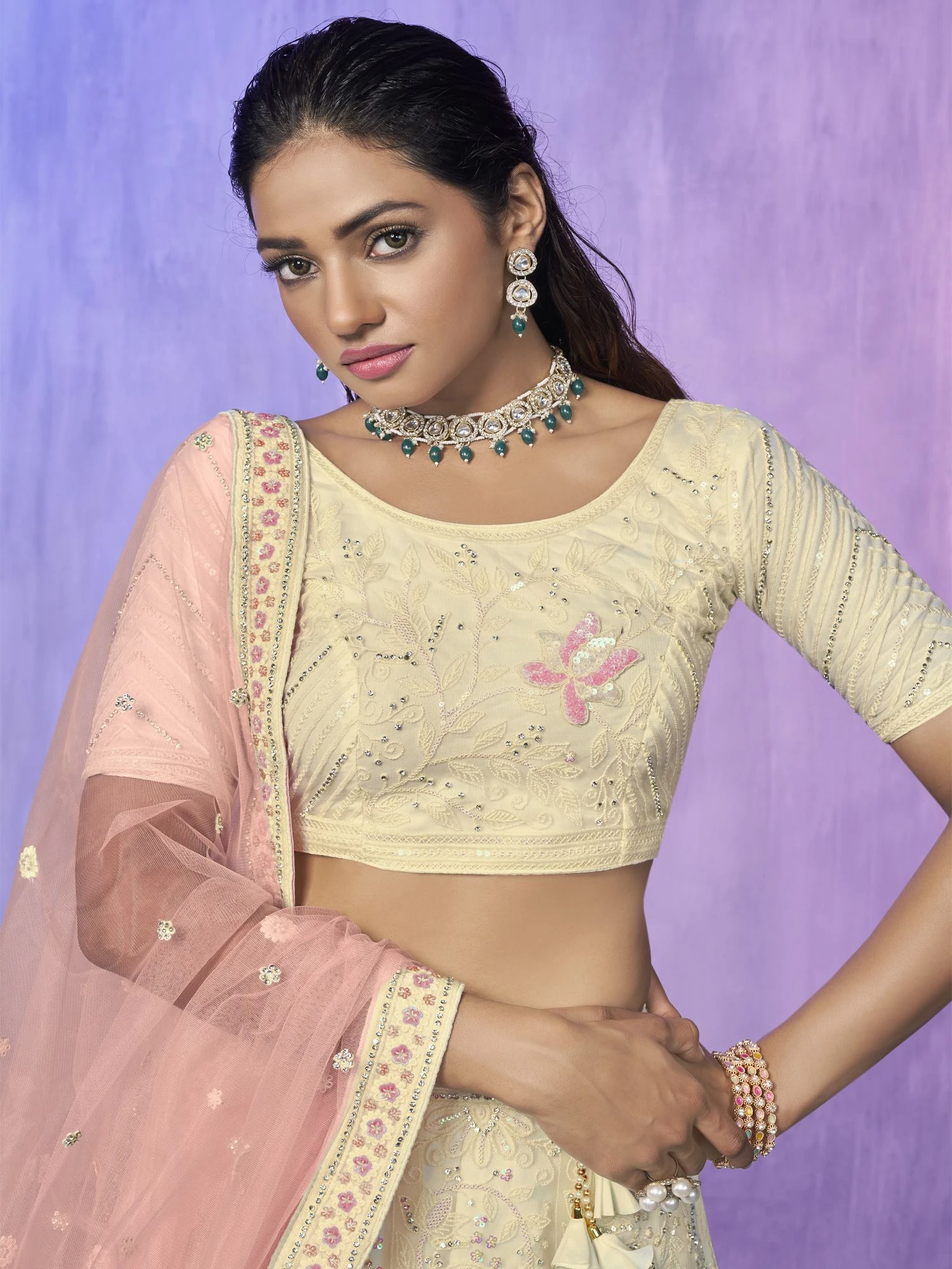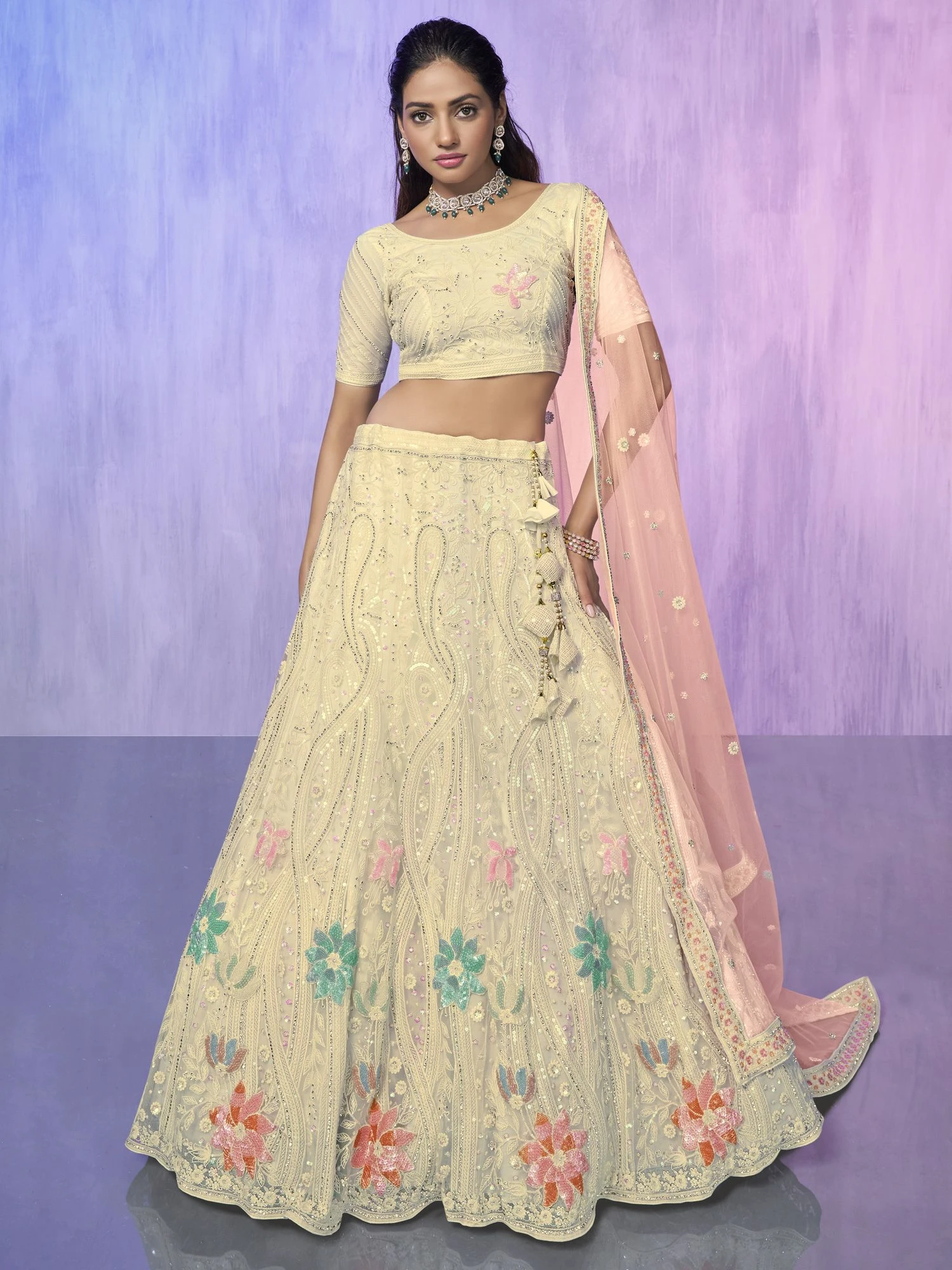 Get the most elegant expression of femininity wearing this bright cream color designer lehenga in net. Decorated with sequins, stones with embroidered work. Paired with a matching cream color embroidered choli in net and baby pink color dupatta, made in net. Note: The accessories featured are purely for fashion purposes. Due to photography reasons, some color variations may occur. The semi-stitched choli and lehenga waist may be customized up to 42 inches.