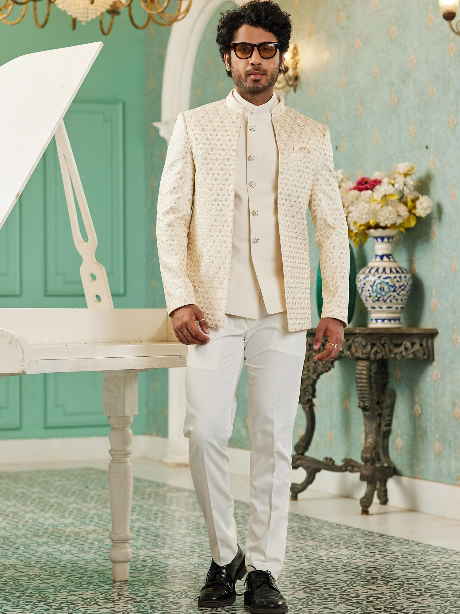 Steal the limelight adorning this cream color jodhpuri suit made in silk. Topped with a embroidered jacket in silk. Paired with a matching white pant in silk. Note: Some color variations may occur owing to photography causes. Up to 1 inch of measurement fluctuation is possible.