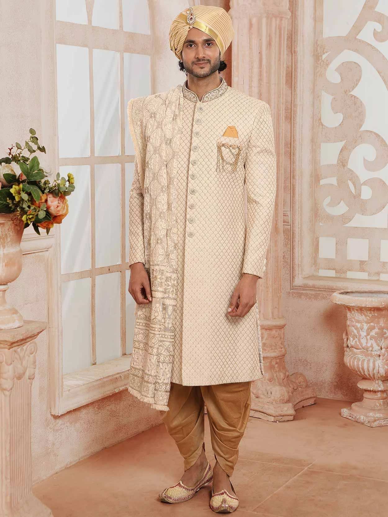 Be in the spotlight dressed in this fabulous Cream Colour Brocade Fabric Mens Sherwani With Matching Patiala Style Bottom And Zari,Thread,Hand Work.