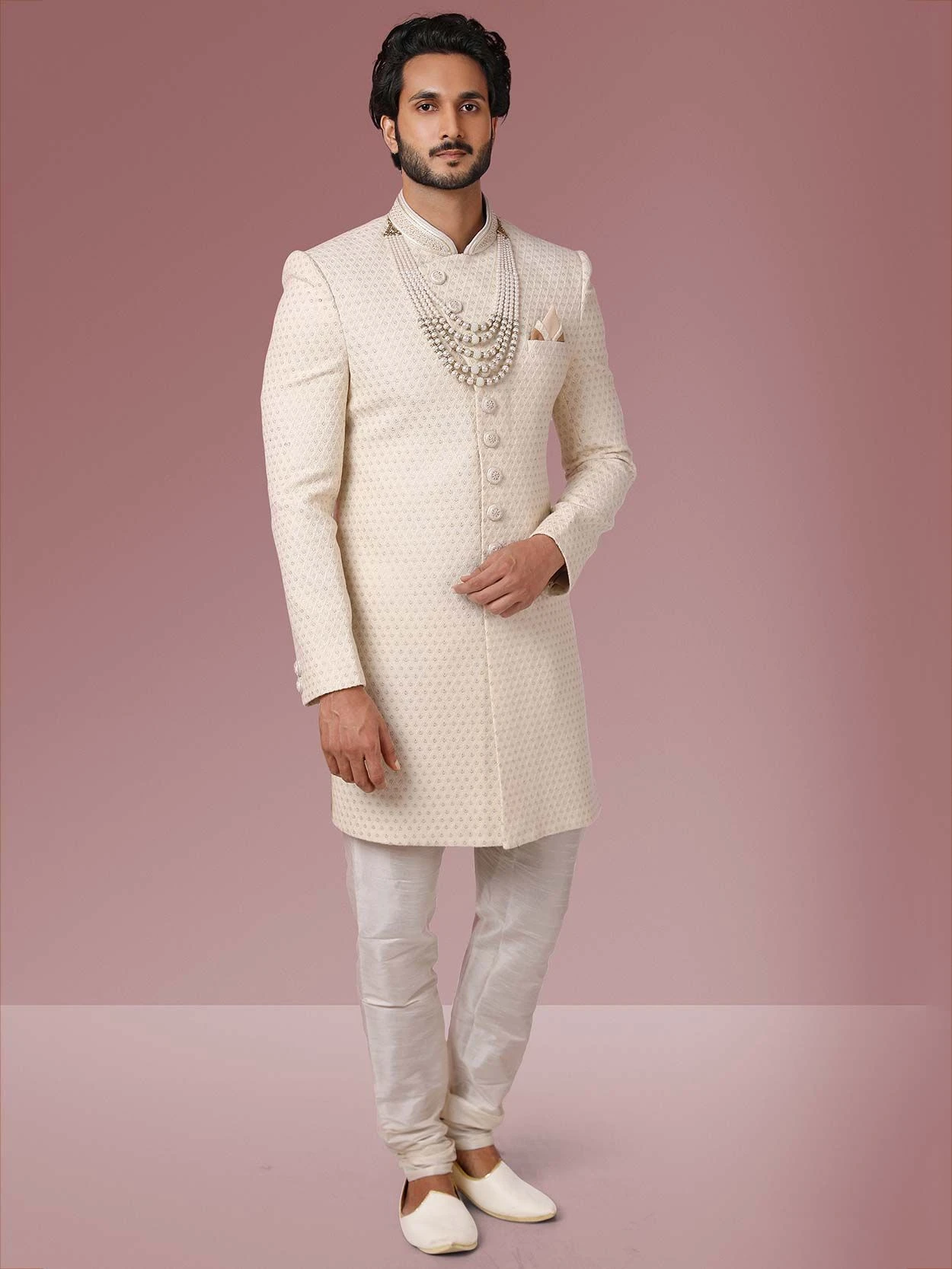 Look adolescent with this Cream Colour Lucknowi Fabric Men’s Sherwani. All patterns are intricately embellished with Embroidered Work work.