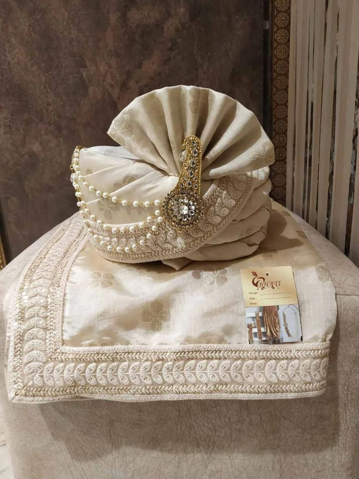 Cream Colour Silk Fabric Groom Sherwani Turban.