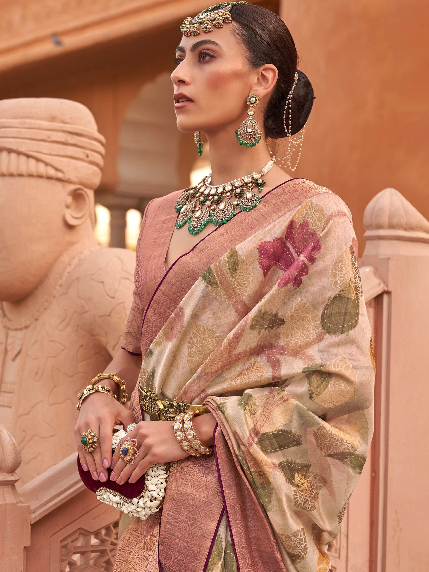 Walk the glam adorning this cream color saree crafted in organza. Enhanced with digital prints all over and zari woven patterns showcasing distinstive borders and pallu. Comes with a contrast matching pink hued woven blouse in silk. Note: The accessories featured are purely for fashion purposes. Due to photography reasons, some color variations may occur. The un-stitched blouse may be customized up to 42 inches.