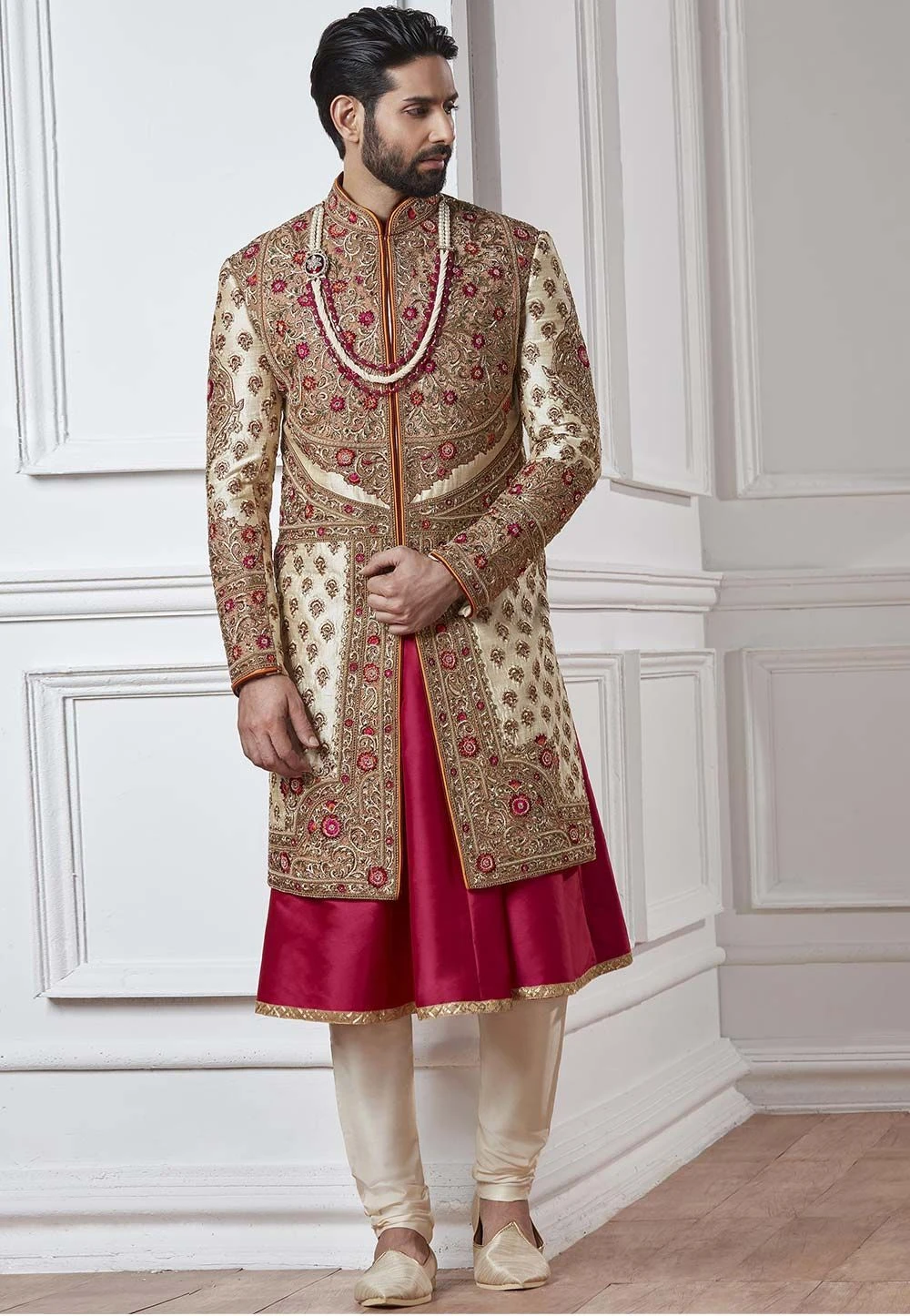 Exclusive Cream,Golden Silk Sherwani With Matching Anarkali Kurta With Churidar Pajama And Zardozi,Embroidery Work.