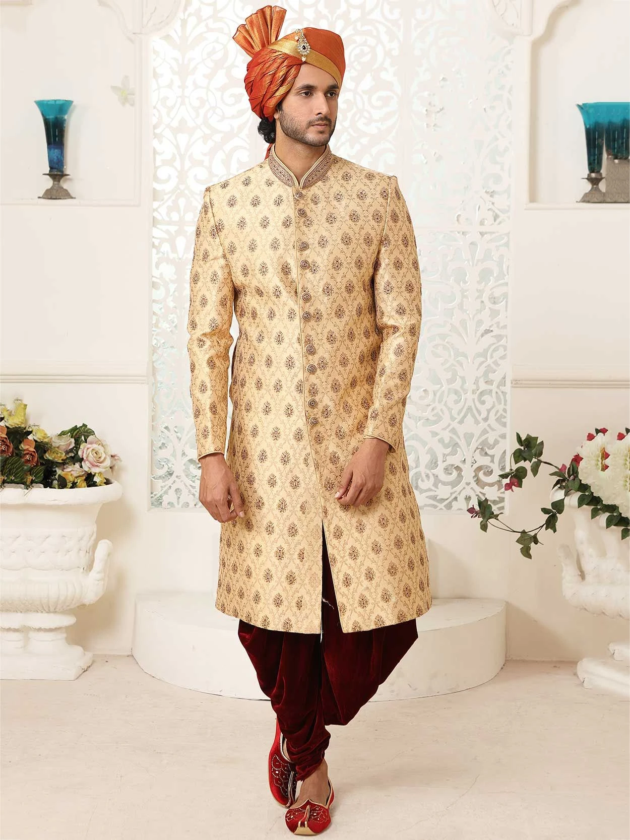 Exclusive Cream,Golden Colour Brocade Fabric Mens Sherwani With Matching Patiala Style Pajama in Zari,Thread,Hand Work.