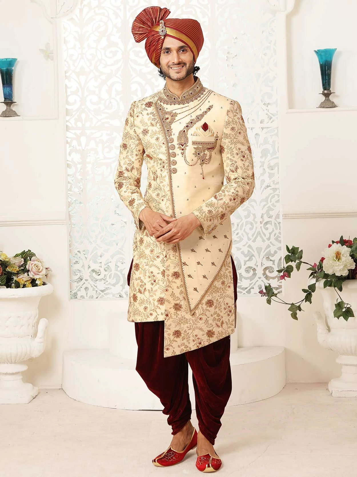 Attractive Looking Cream,Golden Colour Silk Fabric Sherwani With Matching Patiala Style Pajama With Zari,Thread,Hand Work.