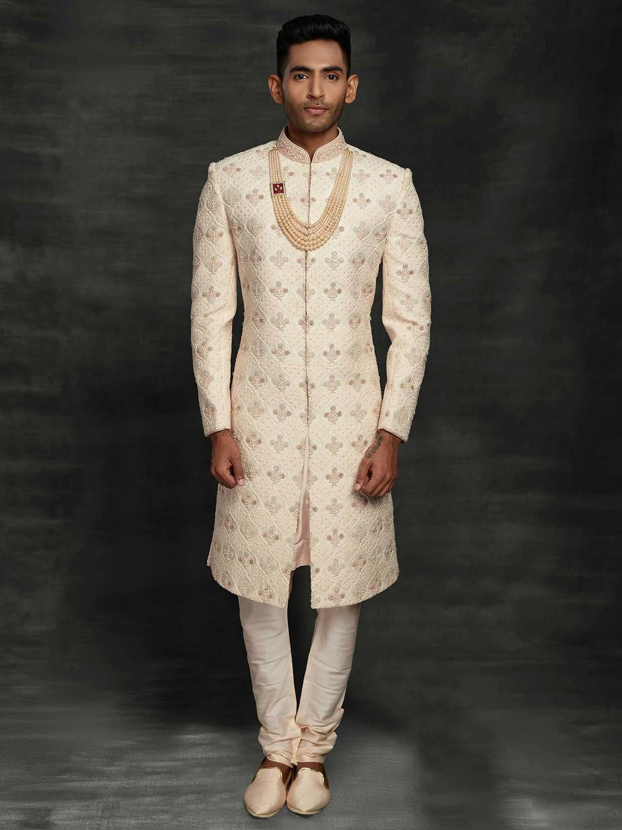 Attain a royal look in this Cream,Golden Colour Silk Fabric Mens Sherwani in Thread,Embroidery,Hand Work.