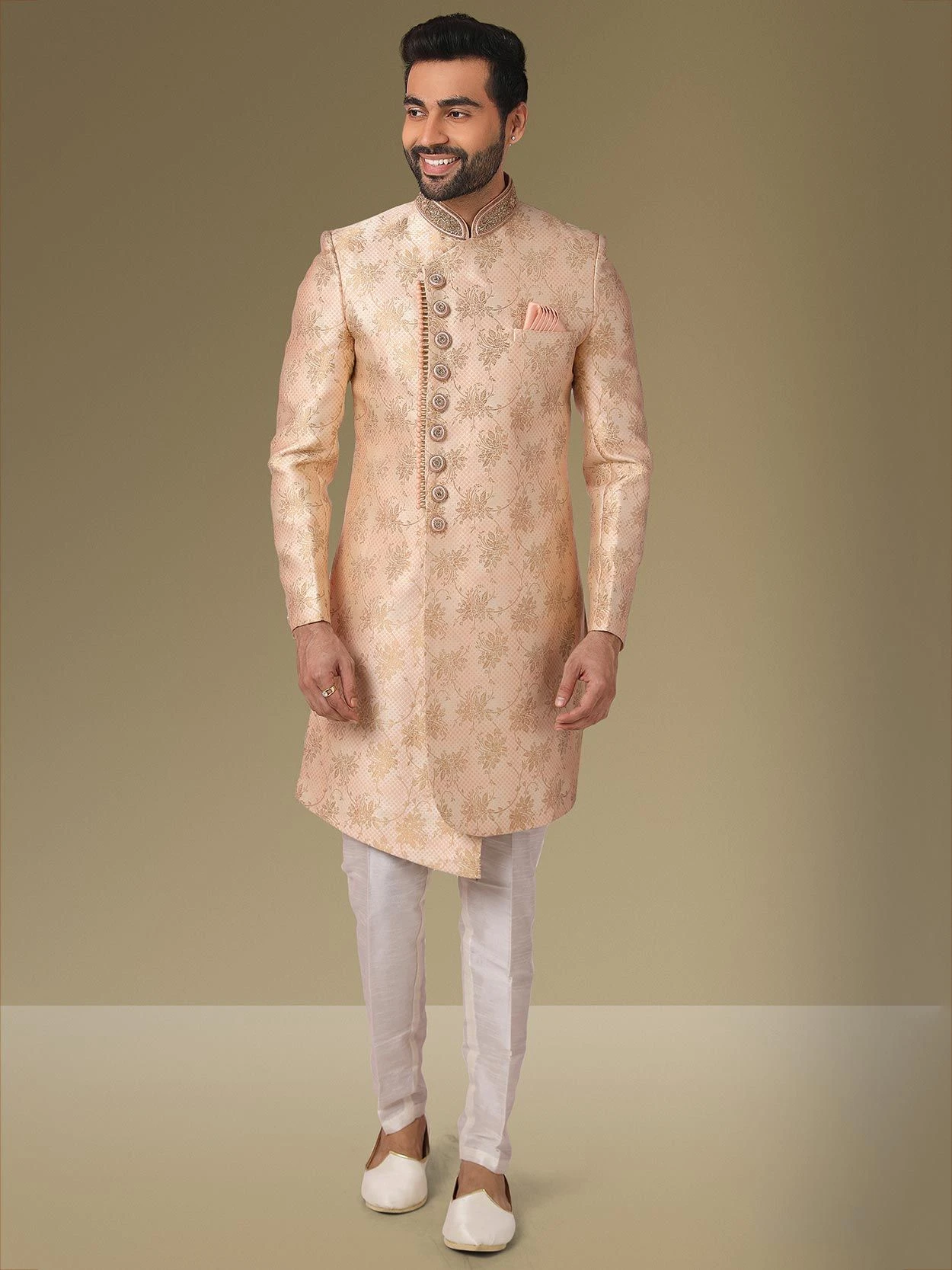 Attain a luxurious ethnic look for your big party with this Cream,Peach Colour Jacquard,Brocade Silk Fabric Men’s Indo Western.