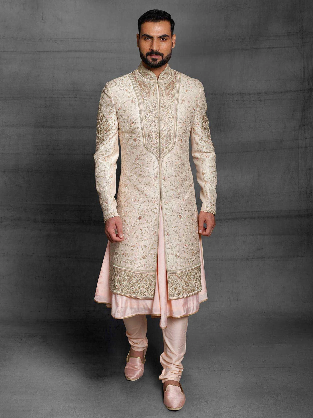 Be in the spotlight dressed in this fabulous Cream,Pink Colour Silk Fabric Men’s Sherwani With Matching Anarkali Kurta with Pajama and Thread,Hand Work.