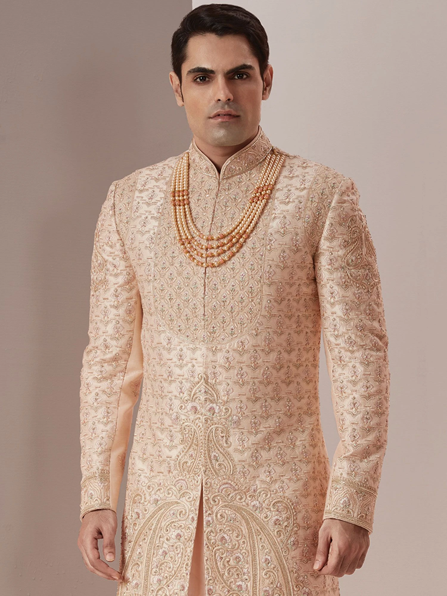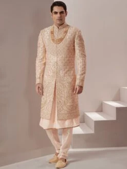 Enlighten your surroundings with this lush cream color sherwani made in silk. Furnished using thread work, hand work embroidery and zardozi embellishment work. Comes with cream color churidaar in silk and a matching kurta underneath. Note: Some color variations may occur owing to photography causes. Up to 1 inch of measurement fluctuation is possible.