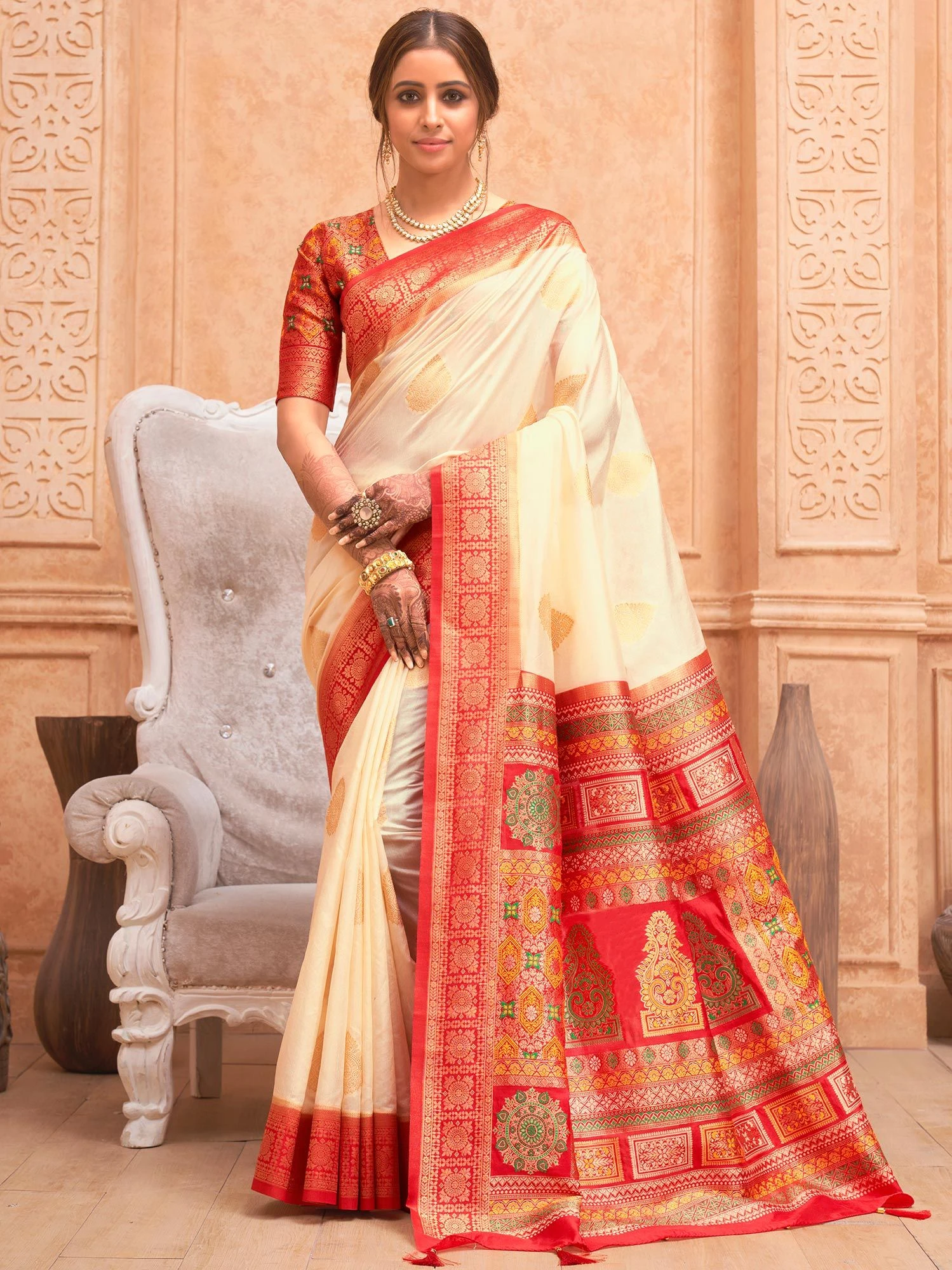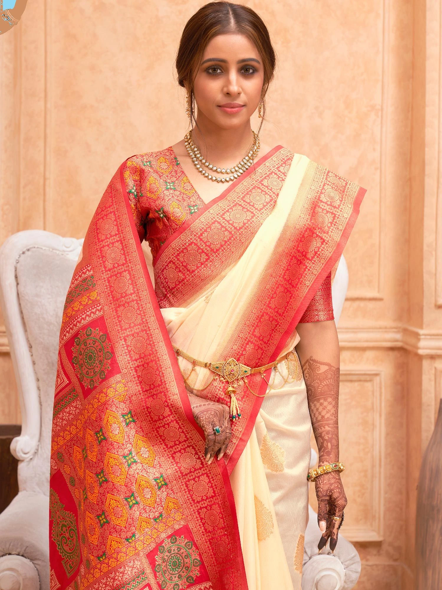Make a stately statement as you wear this soft cream color saree crafted in silk. Elevated using zari woven patterns, showcasing distinstive borders and pallu. Paired with a contrast matching red color blouse in silk. Note: The accessories featured are purely for fashion purposes. Due to photography reasons, some color variations may occur. The un-stitched blouse may be customized up to 42 inches.