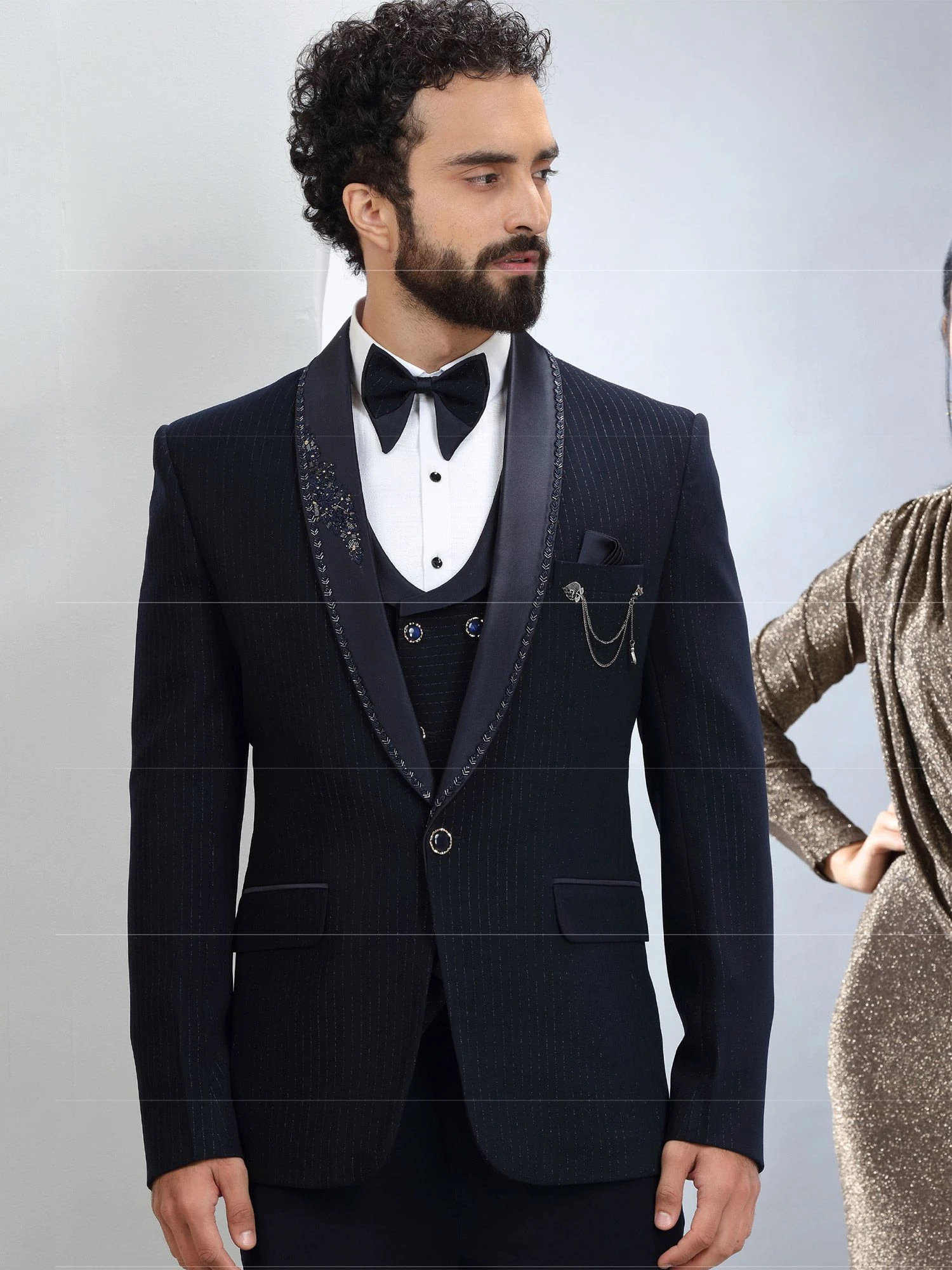 Present a graceful sophisticated look adorning this denim blue color three piece tuxedo made in italian fabric. Furnished with cutdana on lapel and zari strip work embellishments. Paired with a white cotton shirt, bow and a matching blue color pant. Note: Some color variations may occur owing to photography causes. Up to 1 inch of measurement fluctuation is possible.