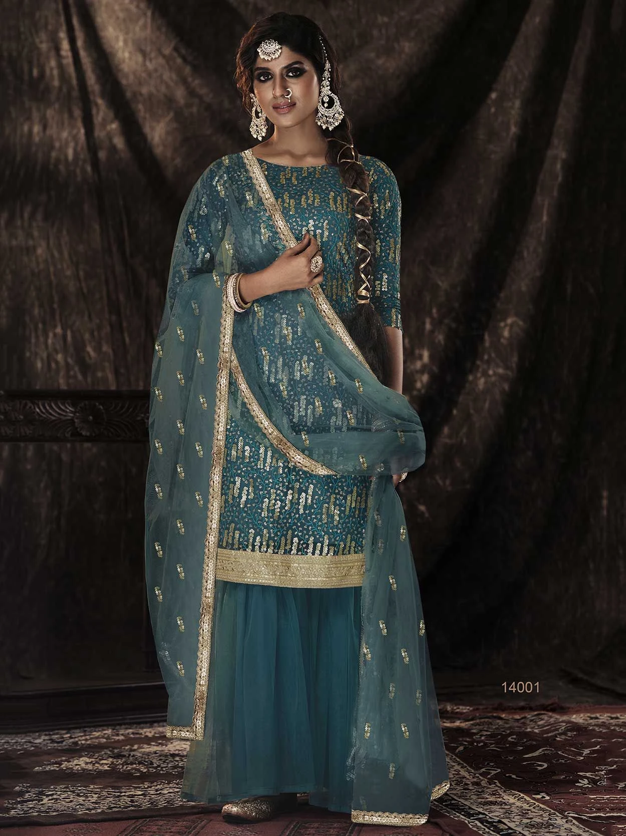 Dark Firozi Colour Net Fabric Attractive Salwar Kameez The lovely Sequin work a substantial attribute of this attire.