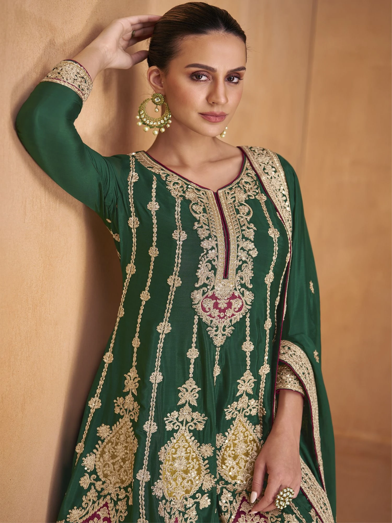Enhance yourself with this dark green color anarkali style kameez in chinon silk. Crafted using sequins, stone with zari work embroidery all over. Teamed with a chinon silk dupatta and a palazzo style bottom, both made in dark green color. Note: Accessories shown are for styling purpose only. Slight color variation may occur due to photographic reasons. The semi-stitched kameez can be customised upto 42 inches.