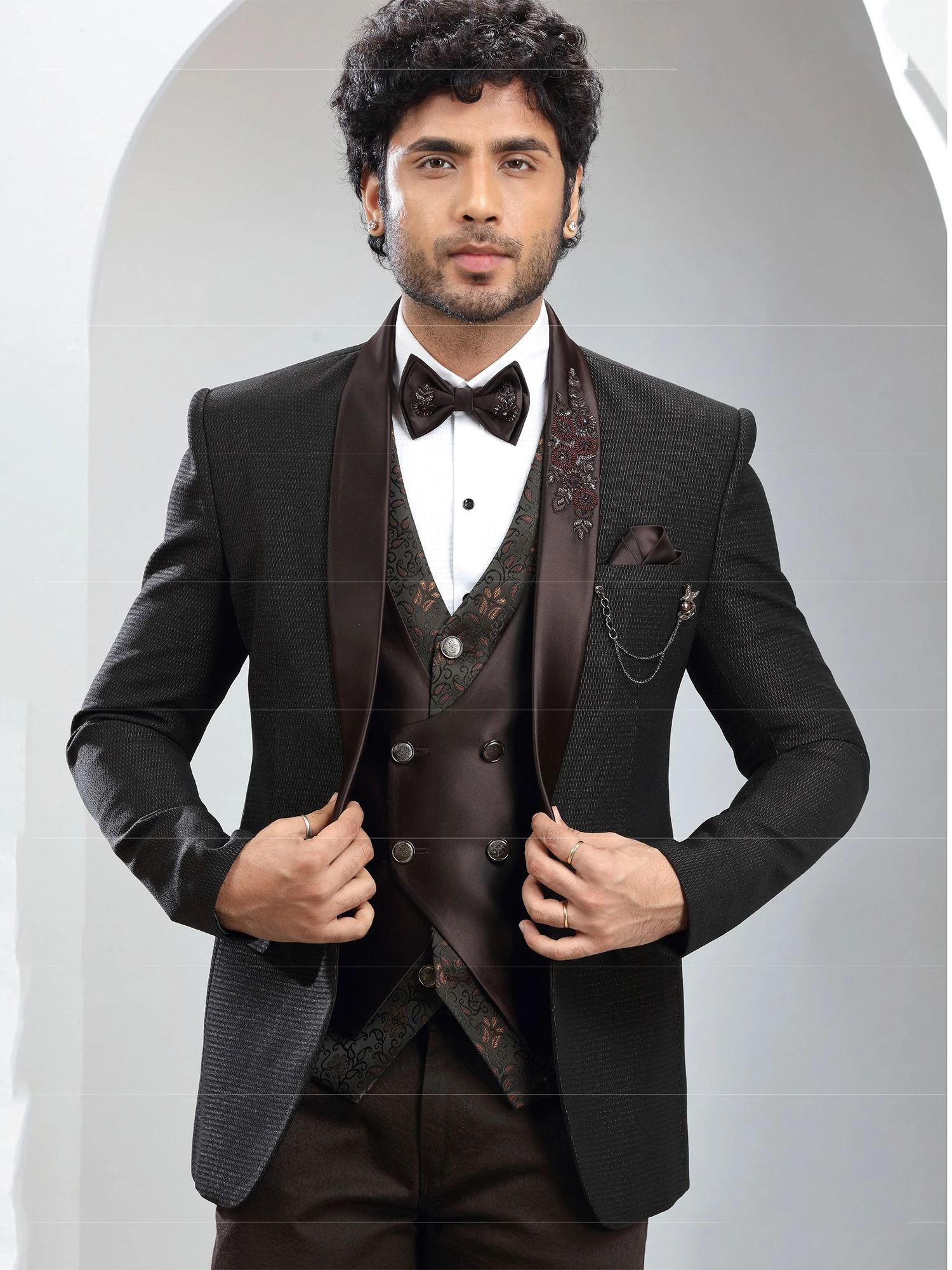 Renew your style statement adorning with this brown color three piece tuxedo made in jute textured italian fabric. Furnished with weavings and cutdana work embellishments. Paired with a white cotton shirt, bow and a matching brown color pant. Note: Some color variations may occur owing to photography causes. Up to 1 inch of measurement fluctuation is possible.
