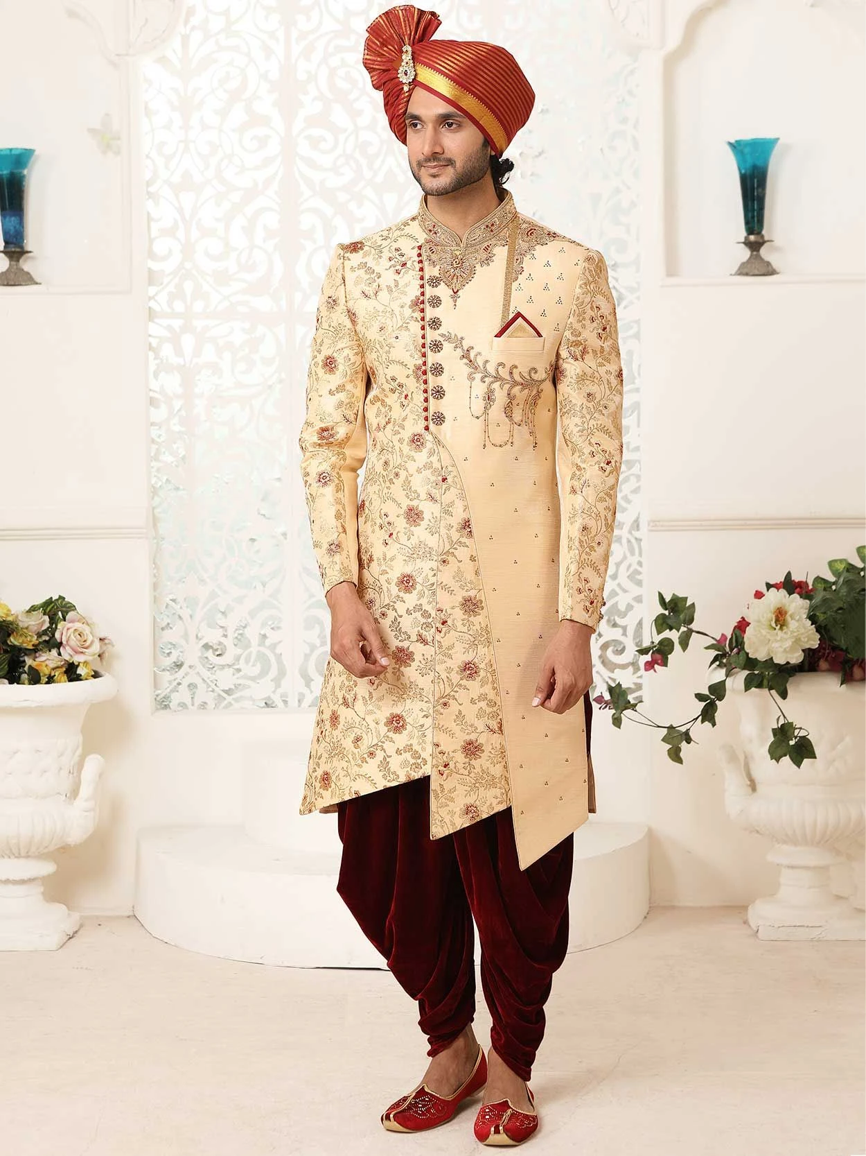 Add subtle glamour to the robust personality in this Golden Colour Silk Fabric Men’s Sherwani With Matching Patiala Style Pajama in Zari,Thread,Hand Work.