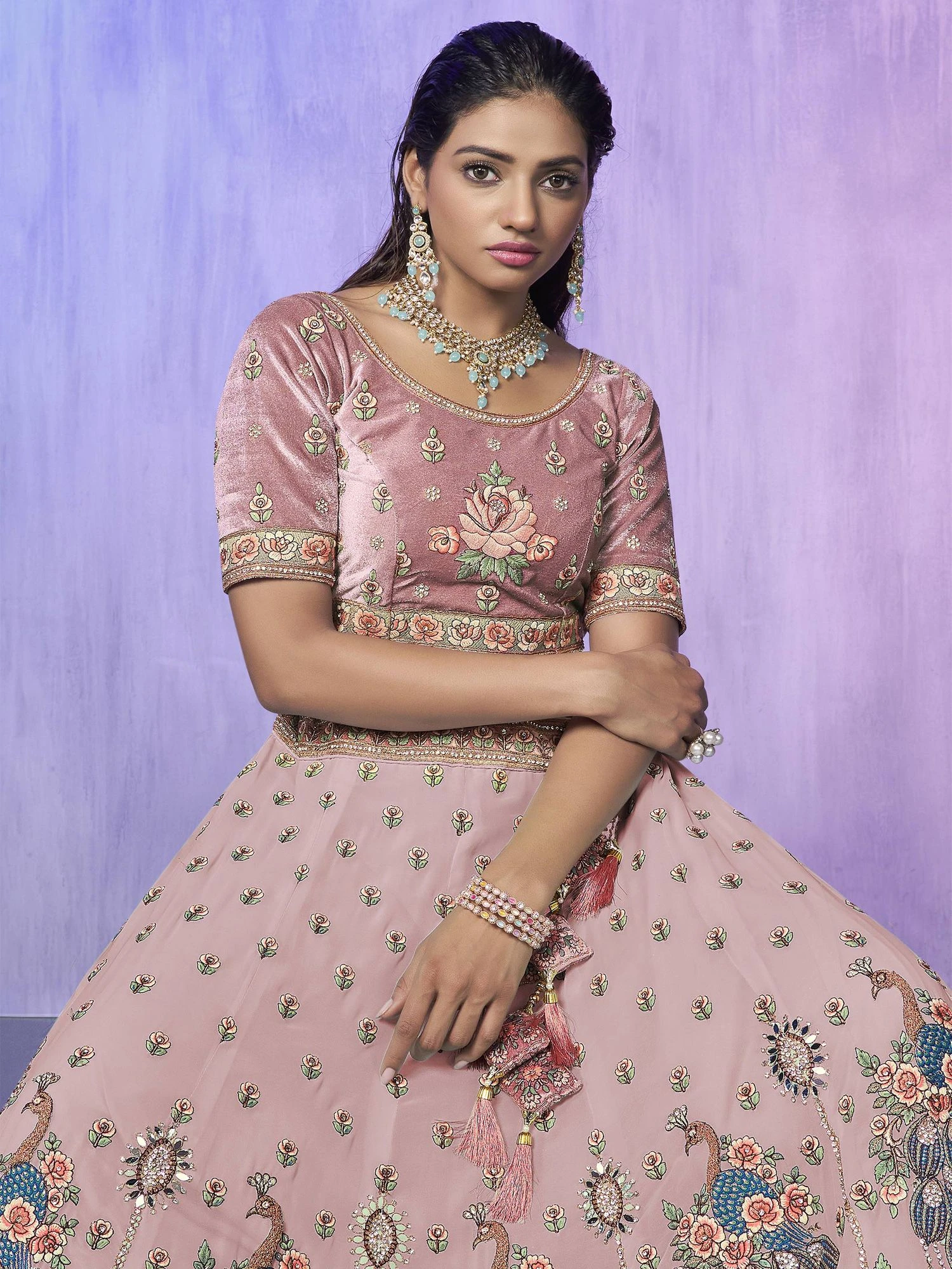 Casting a delicate glow under this dusty pink color designer lehenga in georgette. Decorated with sequins, stone work with floral thread embroidered. Paired with a matching dusty pink color embroidered choli in velvet and pink color dupatta, made in net. Note: The accessories featured are purely for fashion purposes. Due to photography reasons, some color variations may occur. The semi-stitched choli and lehenga waist may be customized up to 42 inches.
