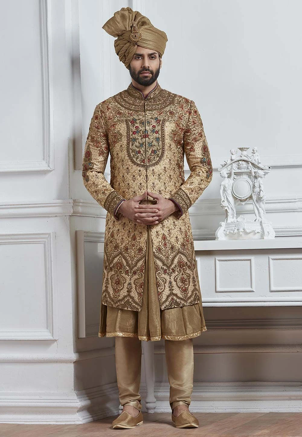 Attain a royal look in this Golden Color Silk Sherwani With Matching Anarkali Kurta With Churidar Pyjama is Embellished Zari,Zardozi,Stone Work.