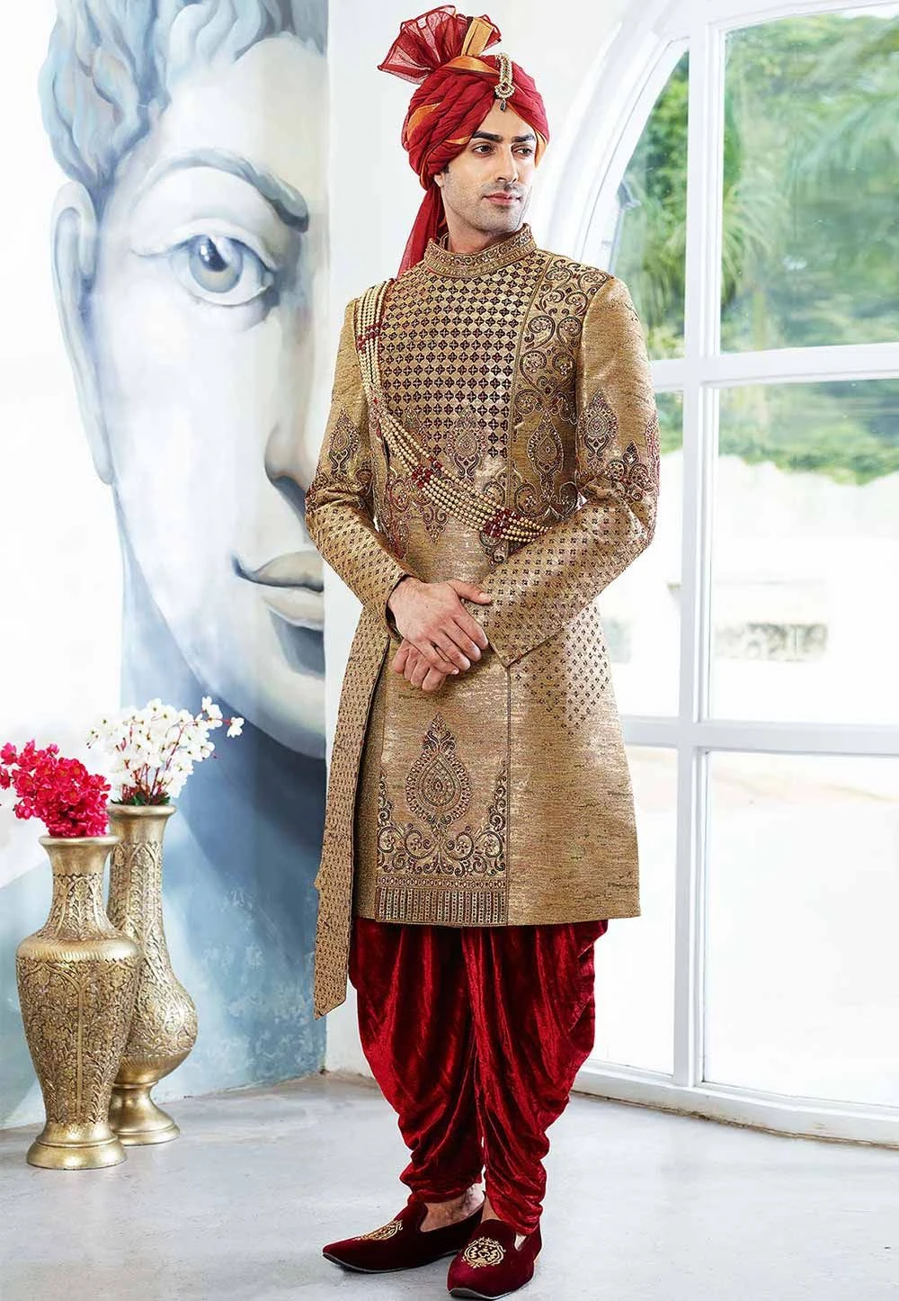 Add subtle glamour to the robust personality in this Golden Colour Brocade Fabric Men’s Sherwani With Matching Patiala And Embroidery,Zardozi,Zari Work.