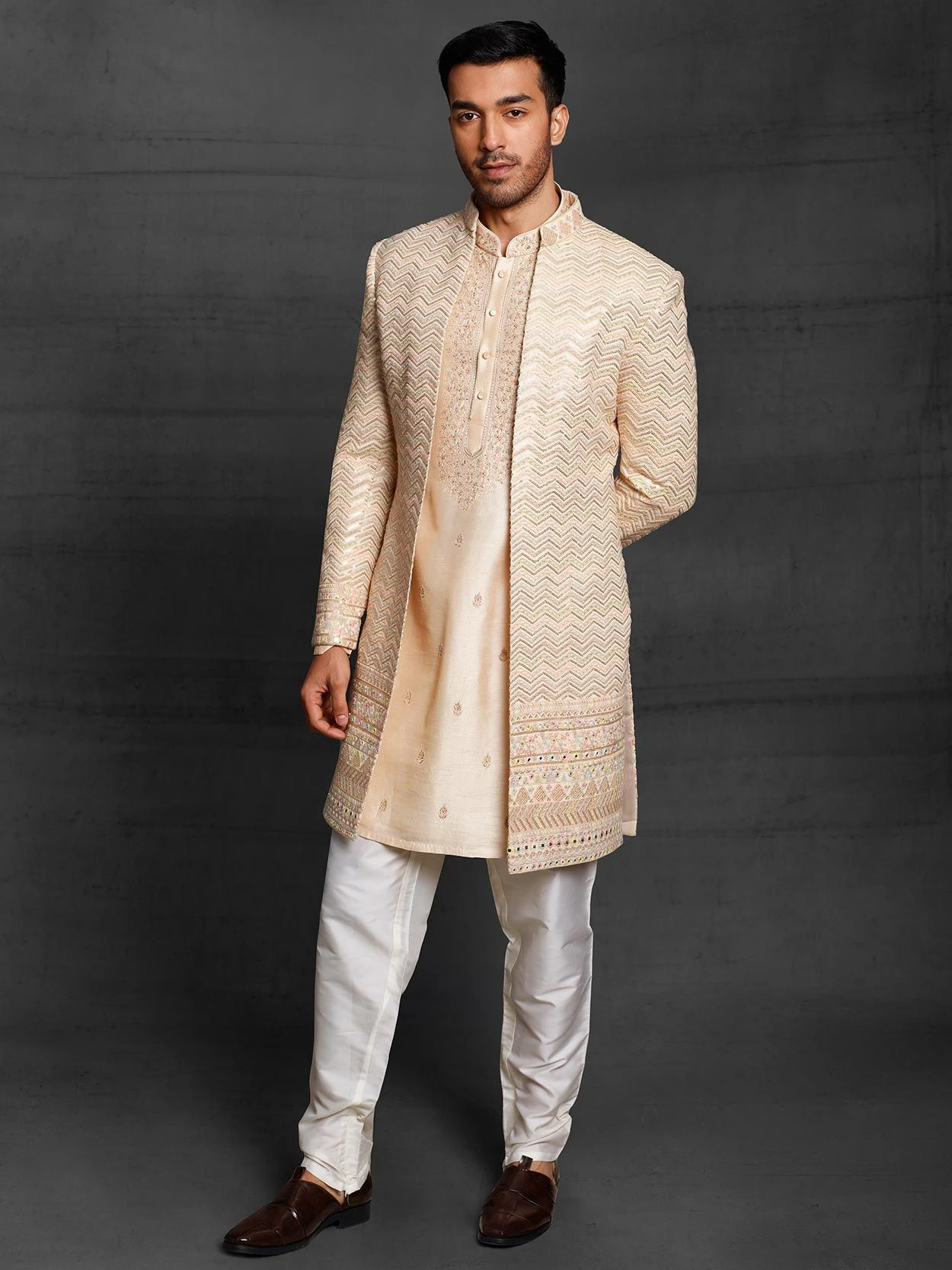 Genuine Attractiveness Will Come Out As A Results Of The Dressing Trend With This Golden Colour Imported Fabric Men`S Indowestern With Thread,Mirror Work.