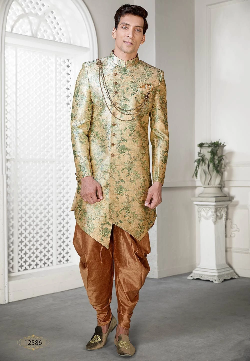 Design And Style And Trend Could Be On The Peak Of Your Elegance After You Dresses This Golden Colour Jacquard Fabric Men`S Indowestern.