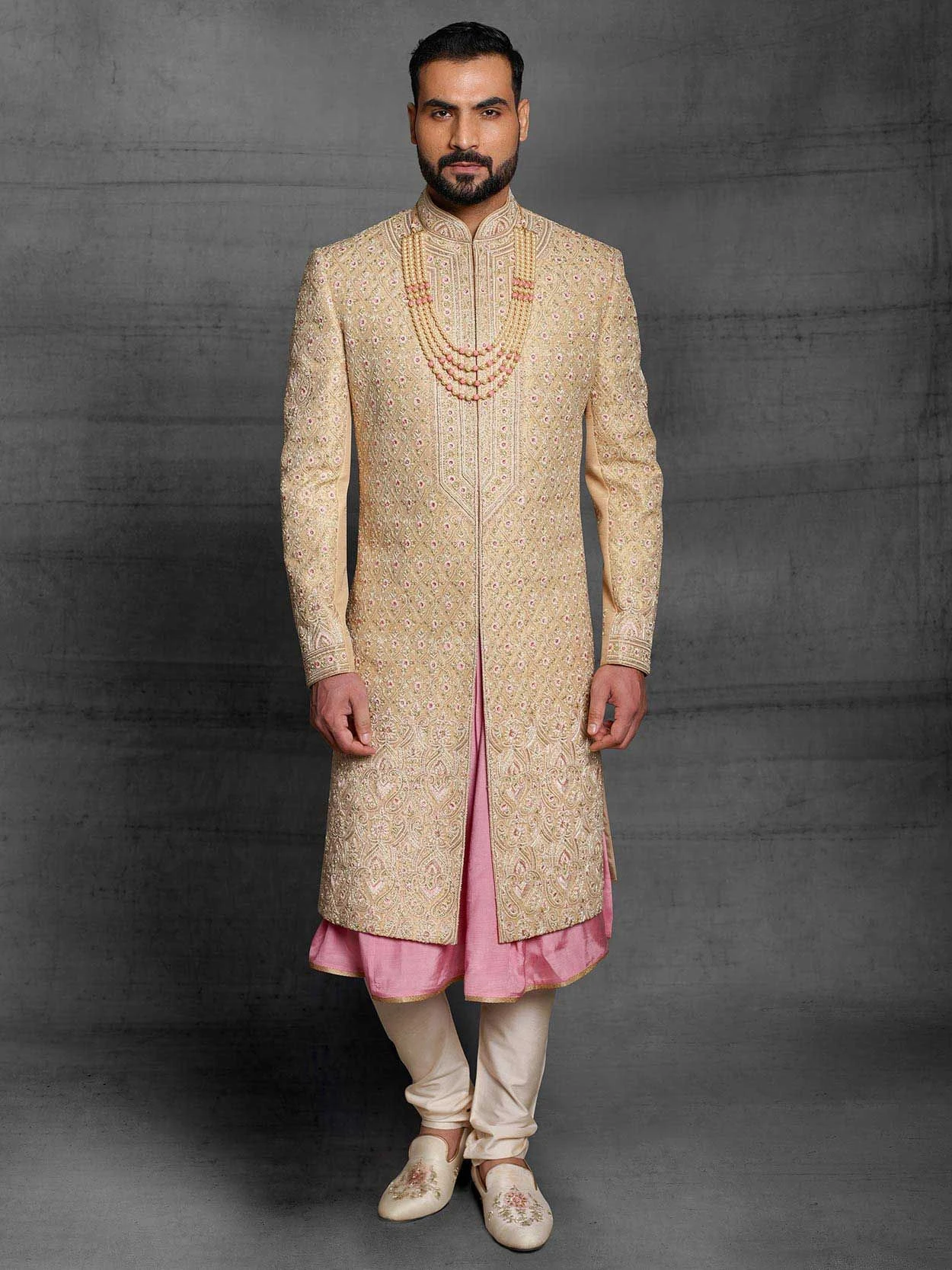 Antique Look Golden,Pink Colour Silk Fabric Mens Sherwani With Matching Anarkali Kurta With Churidar Pajama And Thread,Hand Work.