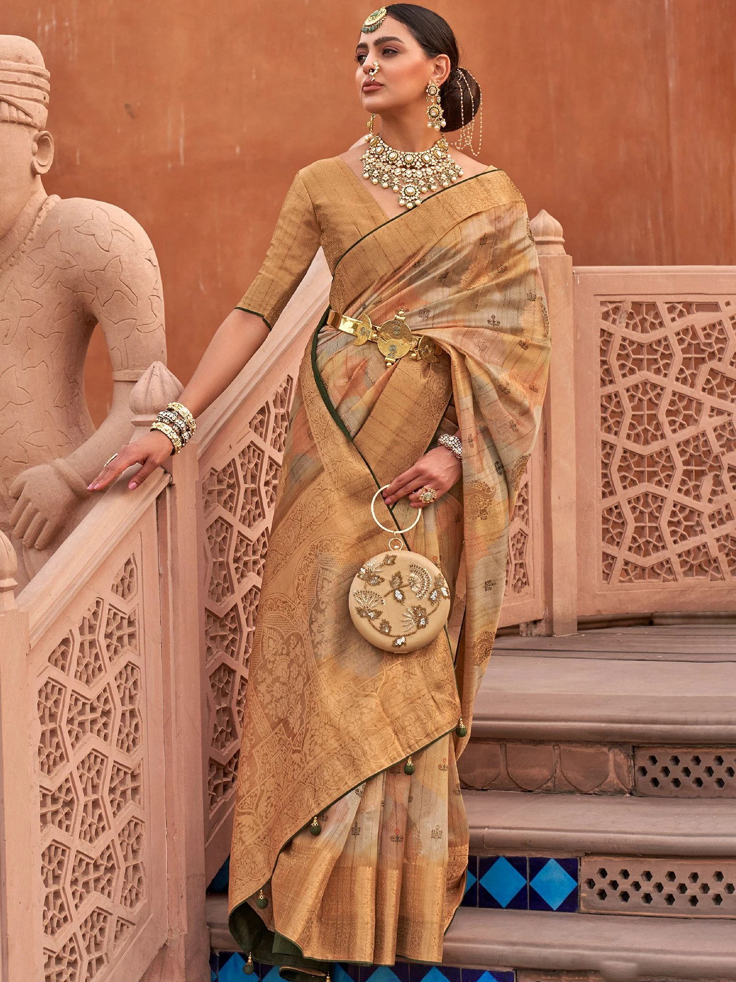 Drape yourself in sunshine adorning this golden color saree crafted in organza. Crafteded with digital floral prints all over and zari woven patterns showcasing distinstive borders and pallu. Teamed with a matching golden color woven blouse in silk. Note: The accessories featured are purely for fashion purposes. Due to photography reasons, some color variations may occur. The un-stitched blouse may be customized up to 42 inches.