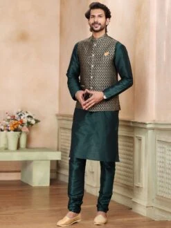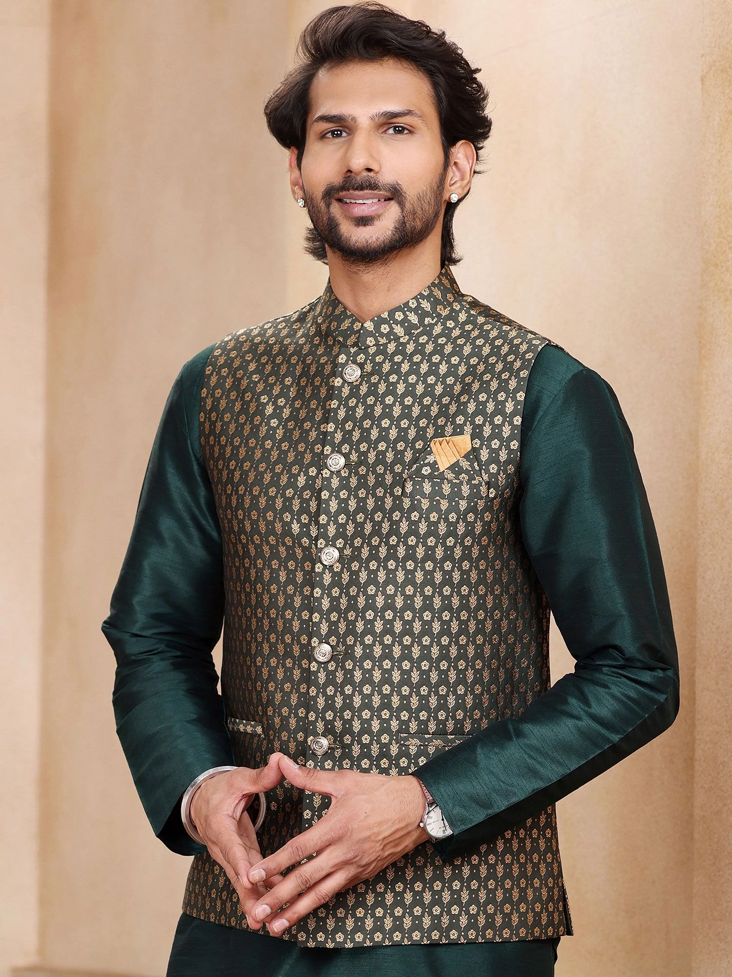 Celebrate in style as you wear this deep green color kurta made in art silk. Topped with a dark grey color jacquard nehru jacket enriched with woven details. Available with a green color churidaar pants in art silk. Note: Some color variations may occur owing to photography causes. Up to 1 inch of measurement fluctuation is possible.