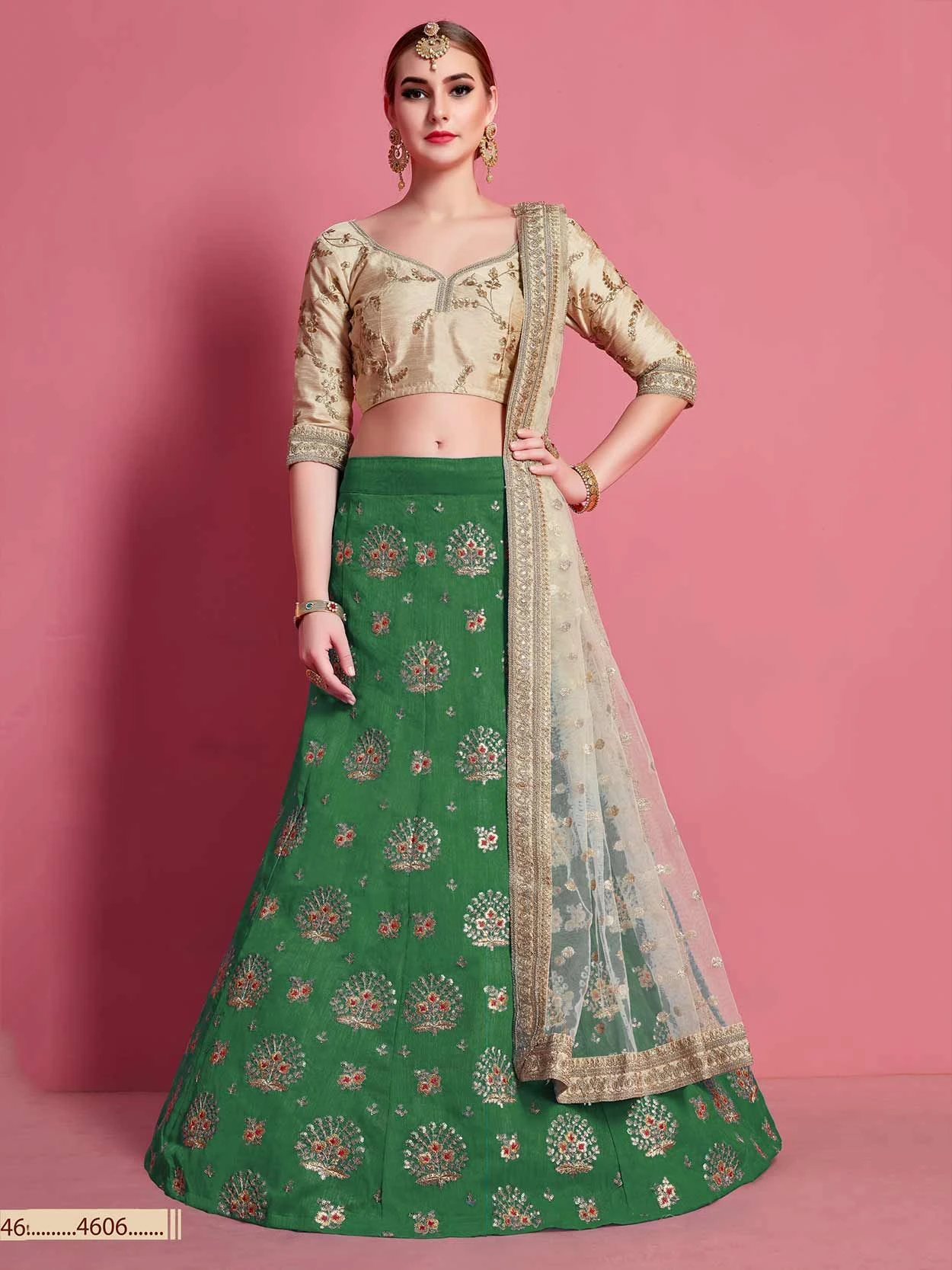 Women’s Attractive A Line Lehenga Style in Green Colour Art Silk Fabric With Lace Work Dupatta This attire is nicely made with Embroidered work.