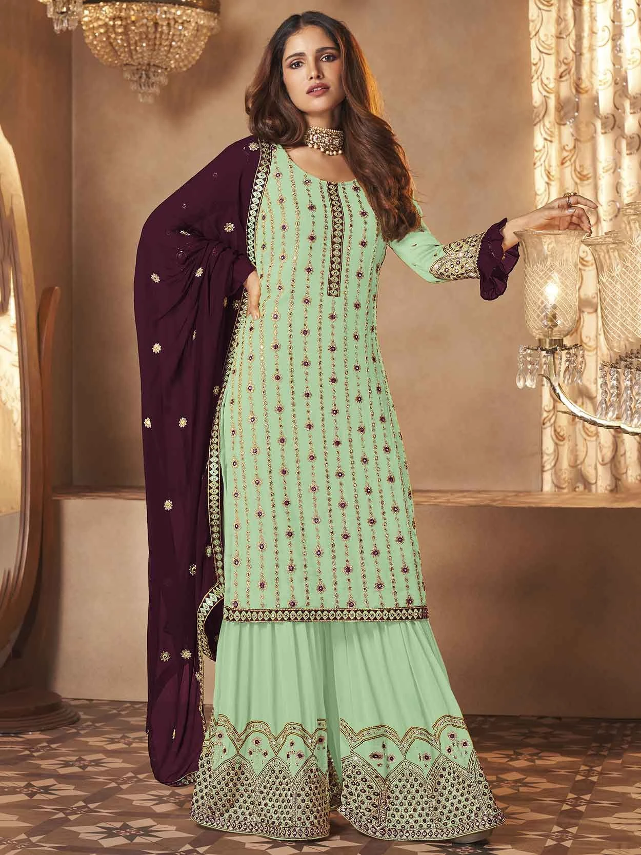 A Line Style Green Colour Georgette Fabric Lovely Semi Stitched Salwar Kameez The lovely Thread,Zari,Mirror work a substantial attribute of this attire.