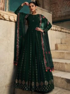 Displaying this deep green color anarkali kameez in georgette. Designed using sequins and thread work embroidery all over. Assembled with a green color embroidered dupatta in shimmer. Note: Accessories shown are for styling purpose only. Slight color variation may occur due to photographic reasons. The semi-stitched kameez can be customised upto 42 inches. The suit does not come with a bottom.