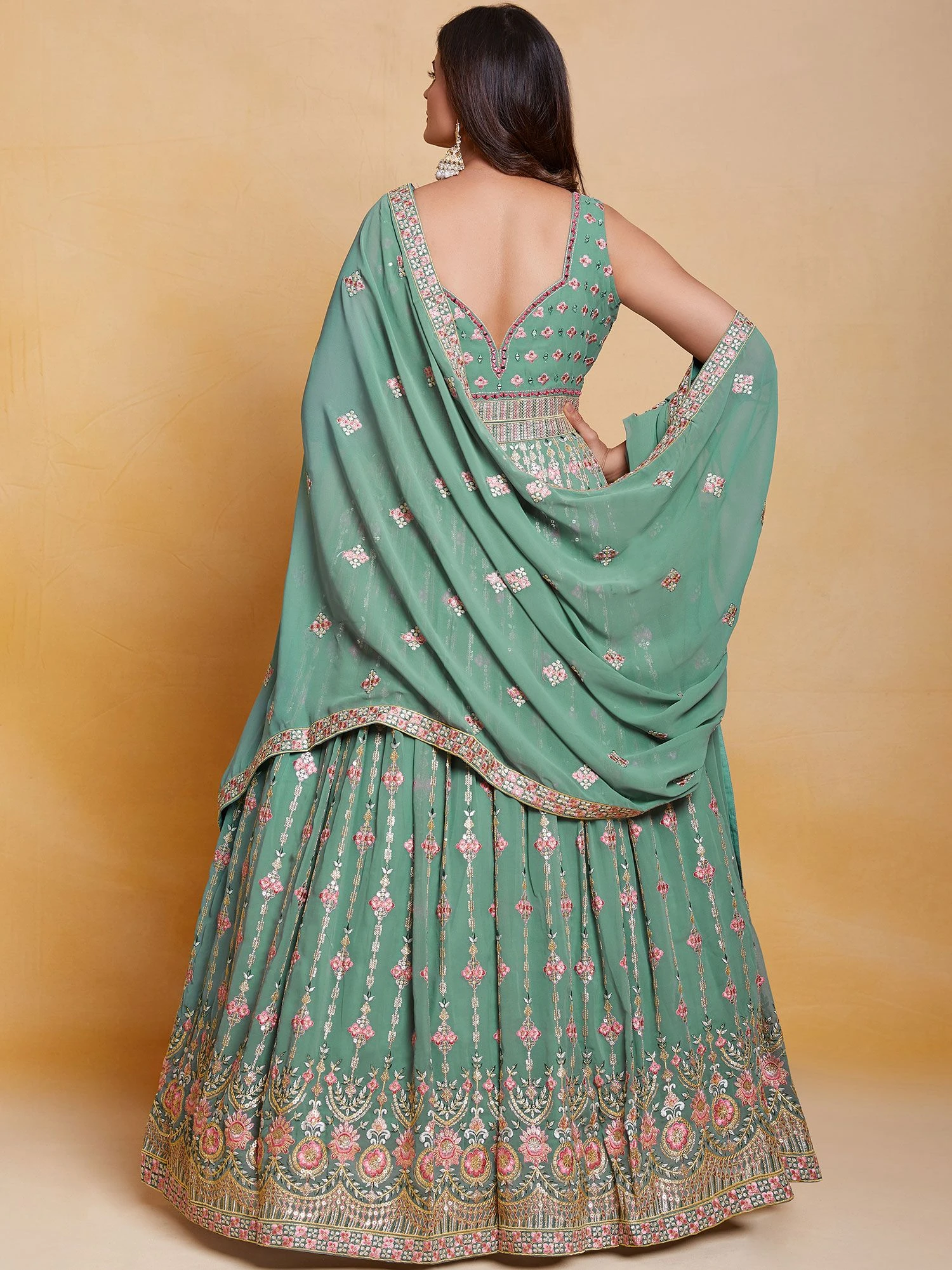 Get all dolled up adorning this sea green hued anarkali kameez in georgette. Furnished using sequins, mirror work and thread work embroidery all over. Comes with a green embroidered dupatta and matching bottom, both made in georgette. Note: Accessories shown are for styling purpose only. Slight color variation may occur due to photographic reasons. The semi-stitched kameez can be customised upto 42 inches.