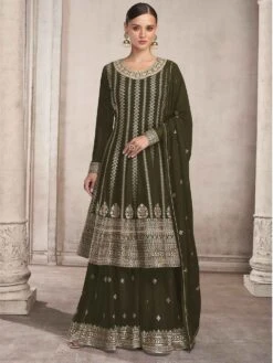 Walk with grace adorning this olive green color flared kameez in georgette. Furnished using thread, zari and sequins embroidery all over. Available with a matching georgette dupatta and a matching sharara in georgette. Note: Accessories shown are for styling purpose only. Slight color variation may occur due to photographic reasons. The semi-stitched kameez can be customised upto 42 inches.