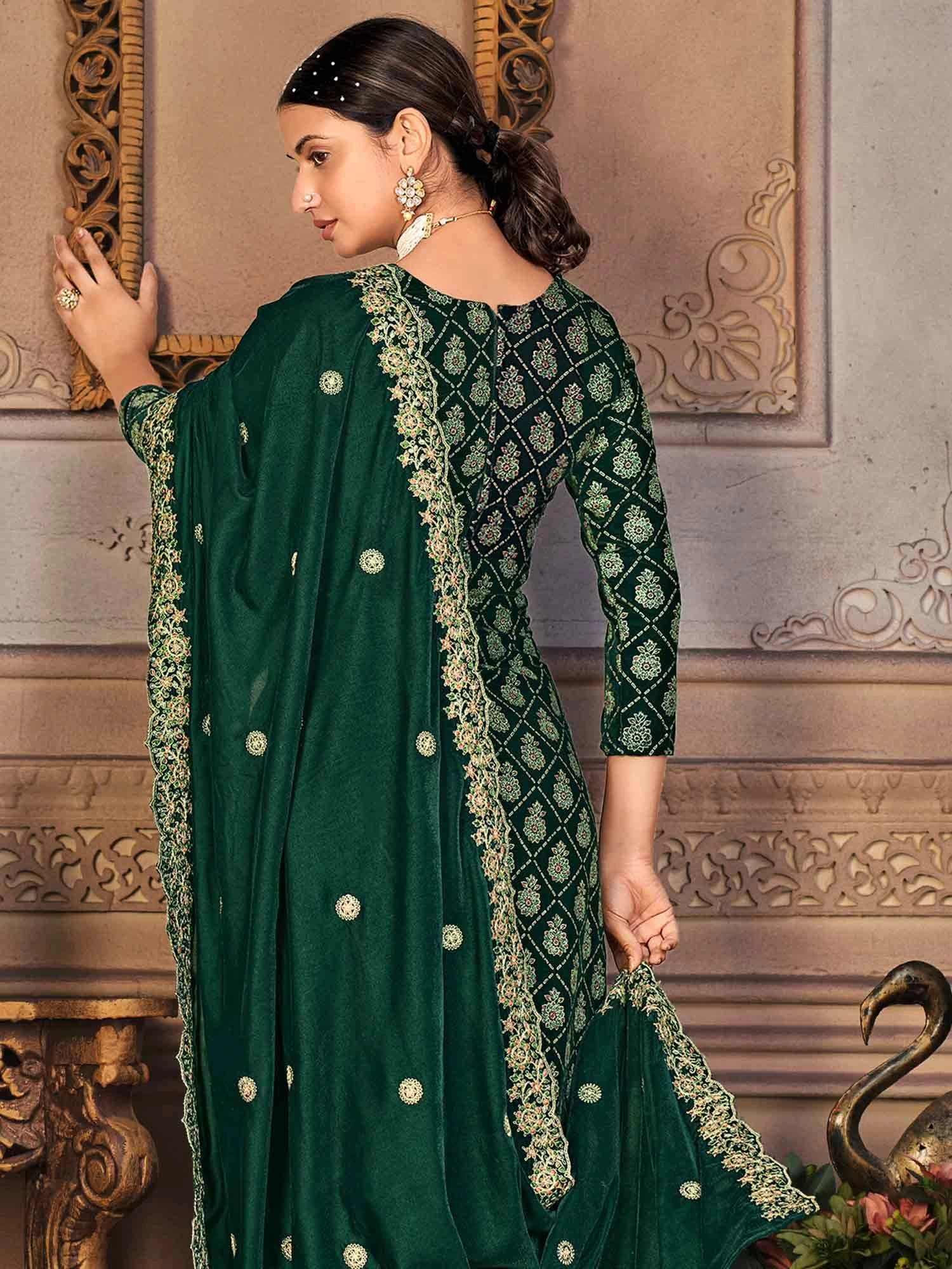 Feel empowered as you dress in this bottle green color straight cut kameez in velvet. Enhanced using dori, thread embroidery with stones work. Comes with a matching pashmina pants and embroidered dupatta in velvet. Note: Accessories shown are for styling purpose only. Slight color variation may occur due to photographic reasons. The semi-stitched kameez can be customised upto 42 inches.